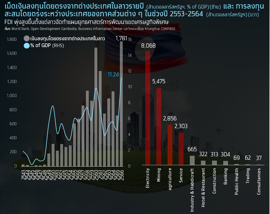 โดยการลงทุนสะสมในช่วง 10 ปีที่ผ่านมา (2553-2564) กว่า 90% กระจายเข้าสู่อุตสาหกรรมพลังงาน เหมืองแร่ เกษตรกรรมเพาะปลูกและแปรรูป ซึ่งเป็นแหล่งรายได้หลักจากการส่งออกของลาว รวมถึงอุตสาหกรรมบริการ เช่น ขนส่งและโลจิสติกส์ ที่ช่วยสนับสนุนกิจกรรมนำเข้าส่งออกและการบริโภคภายในประเทศ การเติบโตของอุตสาหกรรมเหล่านี้ยังเป็นปัจจัยหนุนต่อการพัฒนาเขตเศรษฐกิจพิเศษเพื่ออุตสาหกรรมต่างๆ และสร้างความแข็งแรงของเศรษฐกิจลาวในระยะยาว