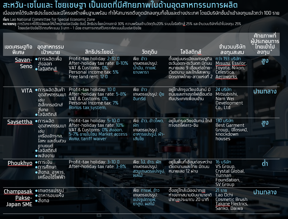 เขตเศรษฐกิจพิเศษสะหวัน-เซโน และไชยเชษฐา เป็น 2 พื้นที่ที่มีศักยภาพสูงสำหรับนักลงทุนไทย โดยเป็นการประเมินศักยภาพเขตเศรษฐกิจพิเศษในภาคอุตสาหกรรมของลาวจาก 5 ปัจจัย ได้แก่ สิทธิประโยชน์ทางภาษี ความพร้อมด้านวัตถุดิบ ระบบโลจิสติกส์ และจำนวนบริษัทที่เข้าไปลงทุน