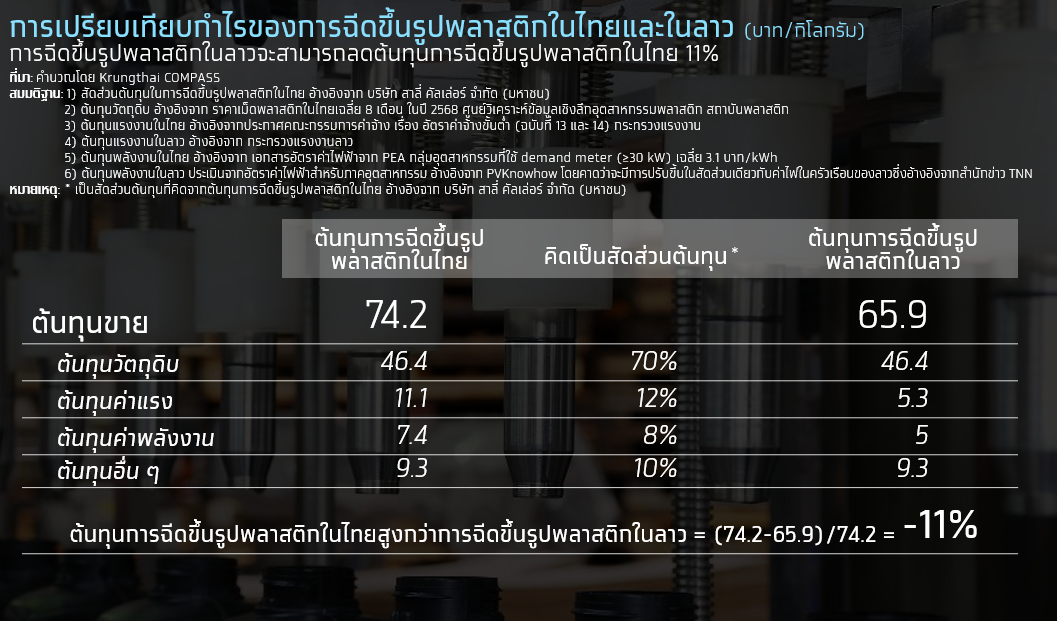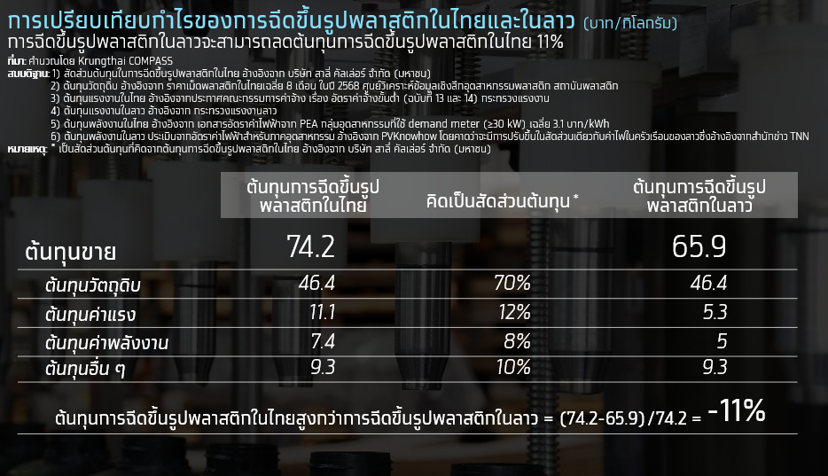 การตั้งโรงงานการผลิตฉีดขึ้นรูปพลาสติกในลาว จึงถือเป็นอีกหนึ่งโอกาสของผู้ประกอบการไทย เนื่องจากเป็นธุรกิจที่ผู้ประกอบการไทยมีทักษะการผลิตและมีแรงงานที่มีความเชี่ยวชาญในปัจจุบัน ซึ่งจากการประเมิน พบว่า หากผู้ประกอบการไทยไปตั้งโรงงานฉีดขึ้นรูปพลาสติกในลาว จะสามารถลดต้นทุนการผลิตได้ราว 11% ซึ่งเกิดจากการลดลงของต้นทุนการผลิตในหมวดแรงงานและพลังงาน ที่มีค่าใช้จ่ายที่ต่ำกว่าในไทยราว 52% และ32% ตามลำดับ