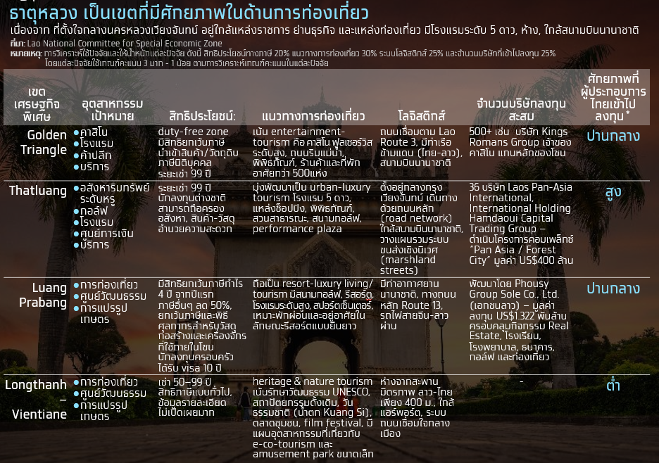 เขตเศรษฐกิจพิเศษธาตุหลวง ซึ่งตั้งอยู่ใจกลางนครหลวงเวียงจันทน์ นับเป็นพื้นที่ที่มีศักยภาพสูงด้านการพัฒนาเมืองและการท่องเที่ยวระดับพรีเมียม โดยเฉพาะในกลุ่มธุรกิจอสังหาริมทรัพย์ โรงแรม รีสอร์ต และค้าปลีกสมัยใหม่ ซึ่งเป็นลักษณะของอุตสาหกรรมหลักที่ถูกกำหนดไว้ในแผนแม่บทของเขตเศรษฐกิจพิเศษธาตุหลวงที่มุ่งเน้นการพัฒนาอสังหาริมทรัพย์ระดับหรู สนามกอล์ฟ โรงแรม ศูนย์การเงิน และบริการ และบทบาทของเวียงจันทน์ในฐานะศูนย์กลางเศรษฐกิจและการบริหารของประเทศ ซึ่งส่งผลให้มีความต้องการสูงในด้านที่อยู่อาศัย การพักผ่อน และบริการเชิงพาณิชย์ โดยเฉพาะจากกลุ่มผู้มีรายได้ระดับกลางถึงสูง
