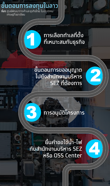 การเข้าไปลงทุนของผู้ประกอบการไทยในเขตเศรษฐกิจพิเศษ (SEZ) ของลาว จำเป็นต้องปฏิบัติตามขั้นตอนทางกฎหมายและข้อกำหนดของทางการลาวอย่างเคร่งครัด โดยกระบวนการเริ่มต้นจากการเลือกทำเลที่เหมาะสมกับลักษณะของธุรกิจ จากนั้นผู้ประกอบการต้องดำเนินการยื่นคำขออนุญาตต่อสำนักงานบริหาร SEZ ที่ต้องการลงทุน โดยจัดเตรียมเอกสารหลักฐาน เช่น แบบฟอร์มการลงทุน แผนธุรกิจ สำเนาหนังสือเดินทาง และเอกสารทะเบียนบริษัท เป็นต้น