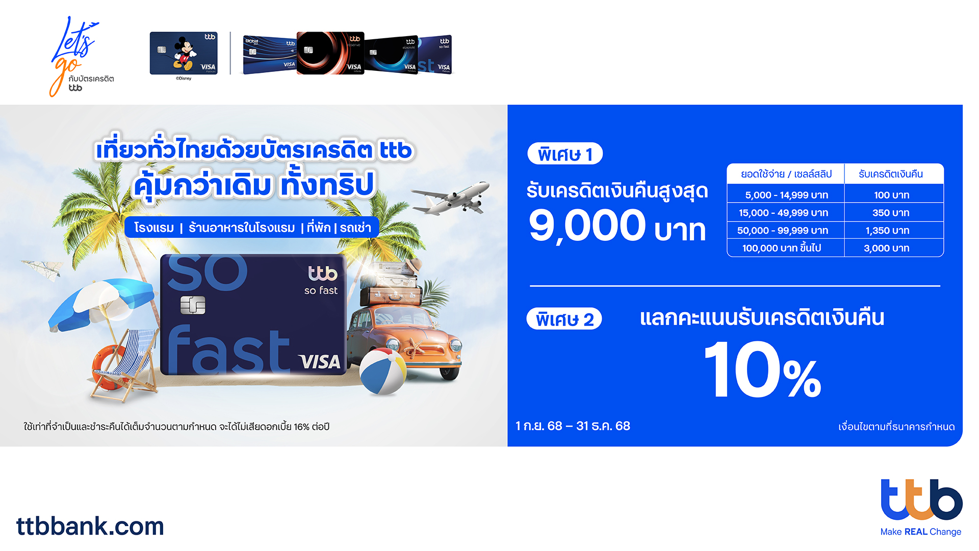 ทีเอ็มบีธนชาต หรือ ทีทีบี มอบสิทธิประโยชน์ที่ตอบโจทย์กลุ่มคนชอบท่องเที่ยว จัดโปรโมชันเที่ยวทั่วไทย คุ้มกว่าเดิมทั้งทริปให้กับลูกค้าผู้ถือบัตรเครดิต ttb บัตรเครดิต ttb Global House และบัตรเครดิต ttb Disney ที่มียอดใช้จ่ายครอบคลุมทั้งโรงแรมและที่พัก ร้านอาหารภายในโรงแรม และบริการรถเช่าในประเทศ ตั้งแต่วันที่ 1 กันยายน 2568 – 31 ธันวาคม 2568 รับสิทธิพิเศษ 2 ต่อ
