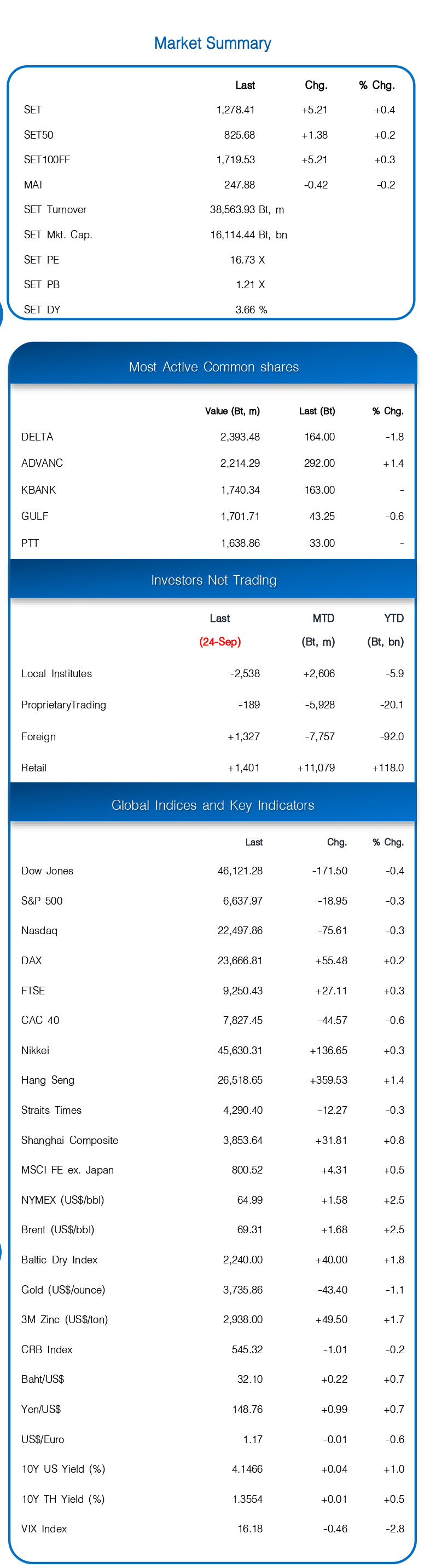 ลุ้นฟื้นตัวต่อแต่จำกัด – แม้ Fitch Ratings ปรับลดแนวโน้มความน่าเชื่อถือไทยเป็น Negative แต่เรามองเป็นความเสี่ยงที่รับรู้ในตลาดอยู่แล้ว ขณะที่ราคาน้ำมันที่ขึ้นแรงเป็นผลดีต่อหุ้นกลุ่มพลังงาน นอกจากนี้วันนี้นายกฯ อนุทินและทีมงานจะพบกับ FETCO รับข้อเสนอสนับสนุนตลาดทุนมองดีต่อตลาดด้วย แนวรับ 1270+/- แนวต้าน 1285-90