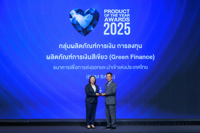 นางสาวดรัสวันต์ ชูวงษ์ ผู้ช่วยกรรมการผู้จัดการ ธนาคารเพื่อการส่งออกและนำเข้าแห่งประเทศไทย (EXIM BANK) รับรางวัลสุดยอดสินค้าและบริการแห่งปี กลุ่มการเงิน-การลงทุน ประเภทผลิตภัณฑ์การเงินสีเขียวจากนายนุรักษ์ มาประณีต องคมนตรี ในงาน BUSINESS+ Product of the Year Awards 2025 จัดโดยนิตยสาร Business+ ร่วมกับวิทยาลัยการจัดการ มหาวิทยาลัยมหิดล ณ โรงแรมสวิสโฮเต็ล กรุงเทพฯ เมื่อวันที่ 25 กันยายน 2568 โดย EXIM BANK มุ่งพัฒนาผลิตภัณฑ์ทางการเงินสีเขียว เพื่อช่วยผู้ประกอบการไทยปรับตัวและเพิ่มขีดความสามารถในการแข่งขันในตลาดโลก ดำเนินธุรกิจสอดคล้องกับมาตรฐานสิ่งแวดล้อมสากล ขับเคลื่อนประเทศไทยและโลกสู่สังคมคาร์บอนต่ำอย่างยั่งยืน