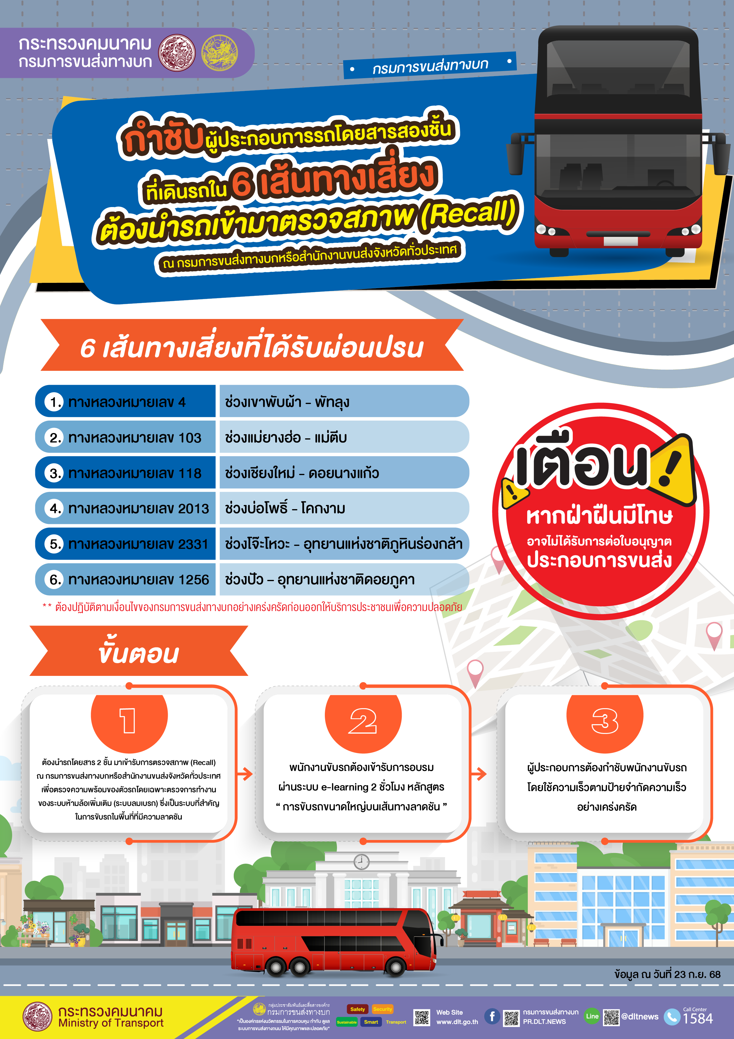 กรมการขนส่งทางบกกำชับผู้ประกอบการรถโดยสารสองชั้นที่เดินรถใน 6 เส้นทางเสี่ยงที่ได้รับผ่อนปรน