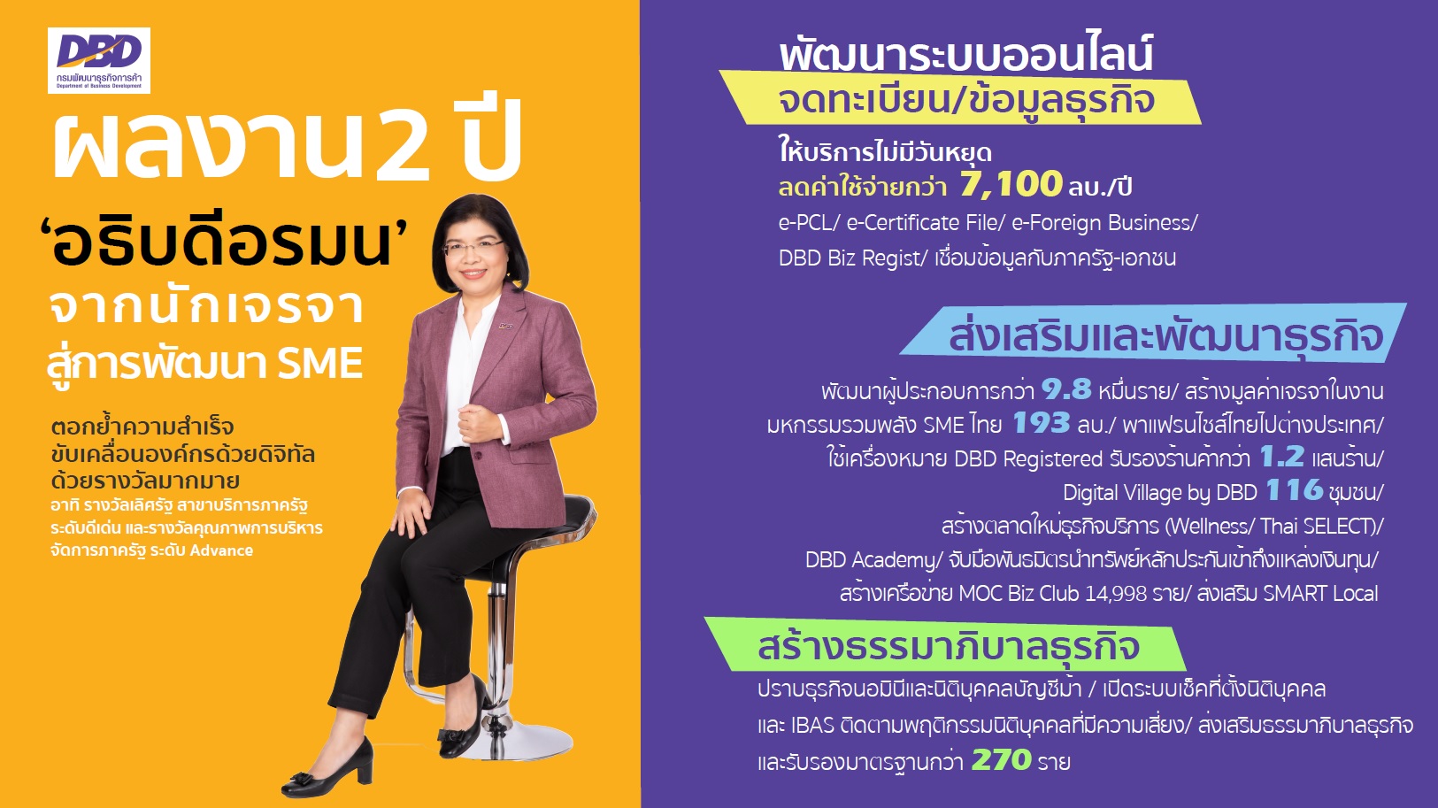ตลอด 2 ปี มีผลการดำเนินงานที่สำคัญและโดดเด่นแต่ละด้าน ดังนี้ ด้านที่ 1 การจดทะเบียนและบริการข้อมูลธุรกิจ มีการนำเทคโนโลยีและนวัตกรรมมาใช้ในกระบวนงานให้บริการต่างๆ เพื่ออำนวยความสะดวกผู้รับบริการ ลดภาระการเดินทาง และลดต้นทุนในการประกอบธุรกิจ โดยได้มีการพัฒนางานบริการตามลำดับ เช่น *ให้บริการระบบจดทะเบียนบริษัทมหาชนจำกัด (e-PCL) เต็มรูปแบบ ลดระยะเวลาให้บริการลง 50% จากเดิม 2 ชั่วโมงต่อ 1 คำขอ เป็น 1 ชั่วโมง *เพิ่มฟีเจอร์การลงลายมือชื่ออิเล็กทรอนิกส์ระบบขอหนังสือรับรองนิติบุคคล (e-Service) สำหรับบริการออกหนังสือรับรองนิติบุคคลในรูปแบบไฟล์ (e-Certificate File) เพื่อให้ผู้รับบริการสามารถใช้บริการได้ทุกวัน ไม่เว้นวันหยุดราชการ โดยมีจำนวนผู้ใช้บริการปี 2566 เฉลี่ยต่อเดือน 166,408 ราย ปี 2567 เฉลี่ยต่อเดือน 260,122 ราย และปี 2568 (ณ สิงหาคม 2568) เฉลี่ยต่อเดือนเพิ่มขึ้นเป็น 304,405 ราย *เปิดให้บริการระบบขออนุญาตและขอหนังสือรับรองการประกอบธุรกิจของคนต่างด้าว (e-Foreign Business) ส่งเสริมสภาพแวดล้อมที่ดีต่อการลงทุนของประเทศ ปัจจุบันมีการยื่นคำขอผ่านระบบครบ 100% แล้ว *เปิดให้บริการระบบจดทะเบียนนิติบุคคลดิจิทัล (DBD Biz Regist) ตั้งแต่วันที่ 16 มกราคม 2568 เพื่อให้ผู้ประกอบการเข้าใช้บริการได้ 24 ชั่วโมง ไม่เว้นวันหยุดราชการ มีการเชื่อมโยงข้อมูลและระบบงานกับหน่วยงานต่างๆ เช่น กรมการปกครอง และกรมสรรพากร (จดทะเบียนภาษีมูลค่าเพิ่ม) เพื่อความถูกต้องของข้อมูล และลดขั้นตอนการเริ่มต้นธุรกิจ โดย ณ เดือนสิงหาคม 2568 มีการยื่นคำขอจัดตั้งผ่านระบบ 75.52% *ขณะนี้ อยู่ระหว่างพัฒนาอีก 1 งานบริการ ได้แก่ ระบบจดทะเบียนการค้าและหอการค้า (e-TACC) เป็นการเพิ่มช่องทางในการยื่นจดทะเบียนสมาคมการค้าและหอการค้า คาดว่าจะเปิดให้บริการได้ในปี 2569