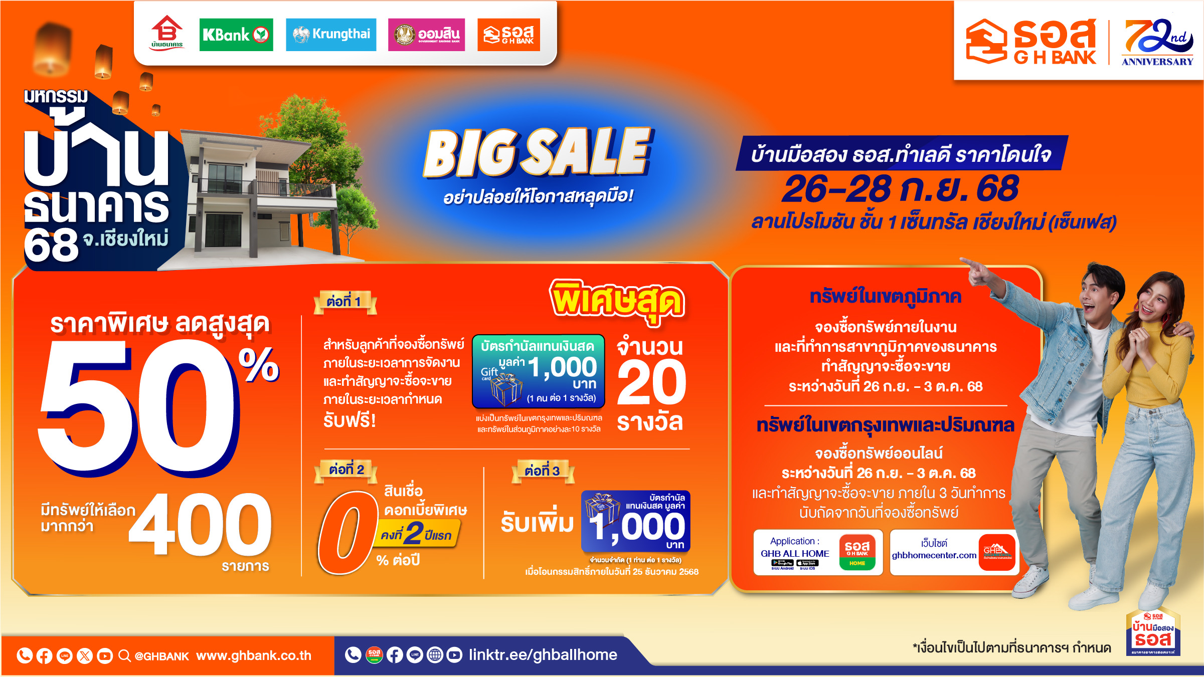 ธนาคารอาคารสงเคราะห์ (ธอส.) เติมฝันคนอยากมีบ้าน นำทรัพย์เด่นกว่า 400 รายการทั่วประเทศ ทั้งประเภทบ้านเดี่ยว ทาวน์เฮ้าส์ บ้านแฝด อาคารพาณิชย์ และคอนโดมิเนียมมาจำหน่ายในราคาพิเศษด้วยส่วนลดสูงสุดถึง 50 % จากราคาปกติ ในงาน “มหกรรมบ้านธนาคาร 68 จังหวัดเชียงใหม่” จัดขึ้นระหว่างวันที่ 26 – 28 กันยายน 2568 ณ ลานโปรโมชัน ชั้น 1 เซ็นทรัล เชียงใหม่ สำหรับผู้ที่สนใจซื้อทรัพย์ในจังหวัดเชียงใหม่และเขตภูมิภาค สามารถจองซื้อทรัพย์ภายในงานและที่ทำการสาขาภูมิภาคของธนาคาร ทำสัญญาจะซื้อจะขายระหว่างวันที่ 26 กันยายน – 3 ตุลาคม 2568 สำหรับผู้ที่สนใจซื้อทรัพย์ในเขตกรุงเทพฯและปริมณฑล สามารถจองซื้อทรัพย์ออนไลน์ ระหว่างวันที่ 26 กันยายน – 3 ตุลาคม 2568 และทำสัญญาจะซื้อจะขายภายใน 3 วันทำการ นับถัดจากวันที่จองซื้อทรัพย์ พิเศษ !! 3 ต่อ ต่อที่ 1 สำหรับลูกค้าที่จองซื้อทรัพย์ภายในระยะเวลาการจัดงานและทำสัญญาจะซื้อจะขาย ภายใน 5 วันทำการ รับฟรีบัตรกำนัลแทนเงินสดมูลค่า 1,000 บาท จำนวน 20 รางวัล (1 ท่านต่อ 1 รางวัล : แบ่งเป็นทรัพย์ในเขตกรุงเทพและปริมณฑล และทรัพย์ในส่วนภูมิภาคอย่างละ 10 รางวัล) ต่อที่ 2 สินเชื่อดอกเบี้ยพิเศษ 0% ต่อปี คงที่ 2 ปีแรก สำหรับลูกค้าที่จองซื้อทรัพย์ภายในระยะเวลาการจัดงานและยื่นขอสินเชื่อภายใน 45 วัน นับถัดจากวันทำสัญญาจะซื้อจะขาย และ ต่อที่ 3 ลูกค้าที่จองซื้อทรัพย์และโอนกรรมสิทธิ์ภายในวันที่ 25 ธันวาคม 2568 รับเพิ่มบัตรกำนัลแทนเงินสดมูลค่า 1,000 บาท (1 ท่านต่อ 1 รางวัล) สำหรับผู้ที่สนใจสามารถดูทรัพย์จริงก่อนจองซื้อออนไลน์ได้ที่ Application : GHB ALL HOME หรือ www.ghbhomecenter.com โดยสอบถามข้อมูลเพิ่มเติมได้ที่ G H Bank Call Center โทร.0-2645-9000 กด 5 หรือ Facebook Fanpage บ้านมือสอง ธอส. หรือดูข้อมูลบ้านมือสอง ธอส. ได้ที่ www.ghbhomecenter.com, Application : GHB ALL HOME และ Line Official Account : @GHBALLHOME