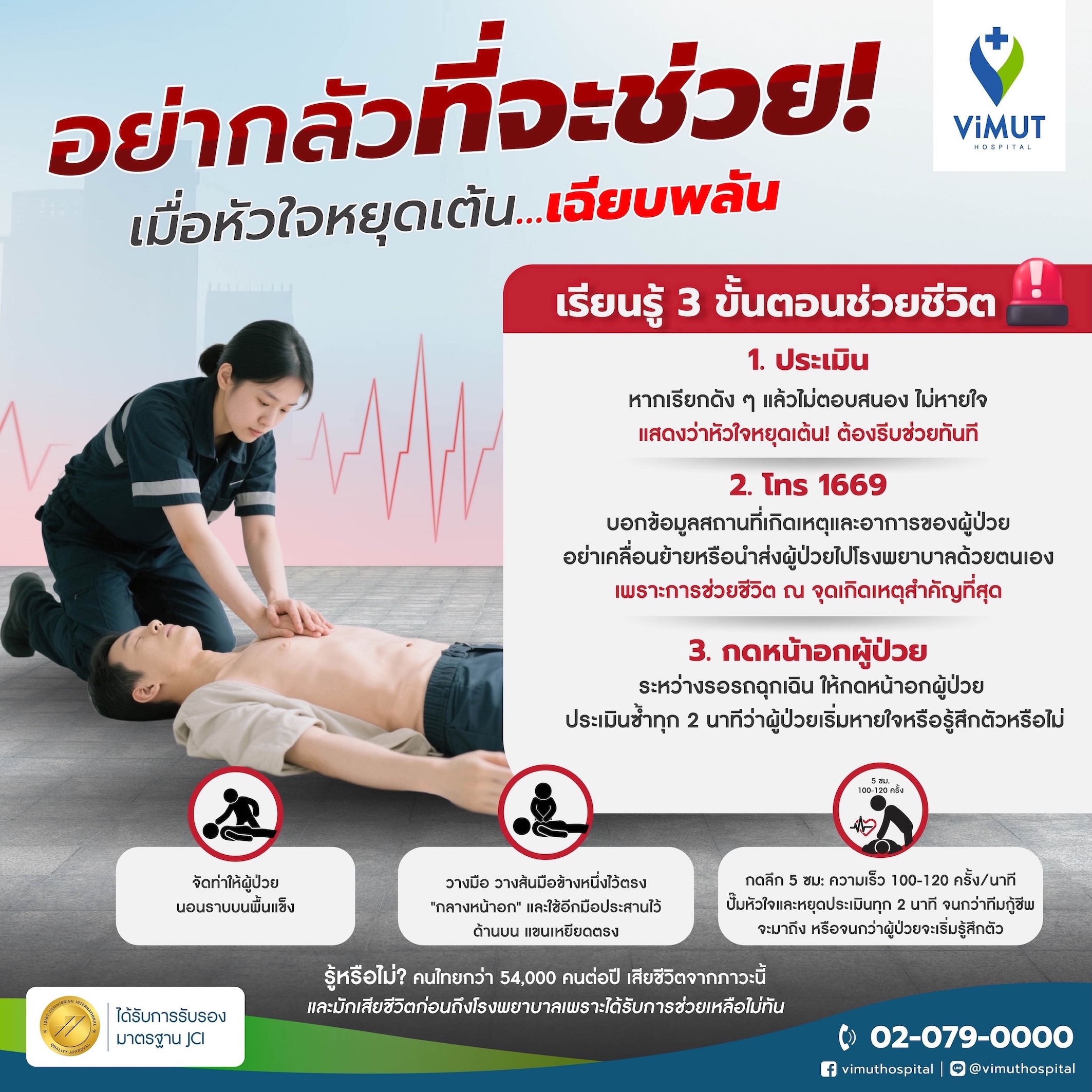 หัวใจของคนเราจะเต้น 60-100 ครั้งต่อนาที เพื่อสูบฉีดเลือดไปเลี้ยงส่วนต่าง ๆ ของร่างกายตลอดเวลา และหากหัวใจหยุดเต้นกะทันหัน เลือดจะไปเลี้ยงอวัยวะสำคัญไม่ได้ ทำให้หมดสติอย่างรวดเร็ว และภายในไม่ถึง 5 นาที เราอาจเข้าสู่ภาวะสมองขาดเลือดและเสียชีวิตได้ทันทีหากไม่ได้รับการช่วยเหลืออย่างทันเวลา ที่น่ากังวลคือ “ภาวะหัวใจหยุดเต้นเฉียบพลัน” เป็นภัยเงียบที่แทบไม่ส่งสัญญาณเตือนล่วงหน้า และเกิดขึ้นได้กับทุกคนแม้แต่คนที่แข็งแรงและออกกำลังกายเป็นประจำ โดยกรมควบคุมโรคเผยว่า คนไทยเสียชีวิตจาก “ภาวะหัวใจหยุดเต้นเฉียบพลัน” มากกว่า 54,000 รายต่อปี วันนี้ นพ.ราม บรรพพงษ์ เวชศาสตร์ฉุกเฉิน ศูนย์ฉุกเฉิน รพ.วิมุต จะมาเล่าถึงการรับมือกับภาวะหัวใจหยุดเต้นเฉียบพลันและเน้นย้ำถึงสิ่งที่ควรทำหากคนรอบตัวต้องเผชิญกับภัยร้ายนี้