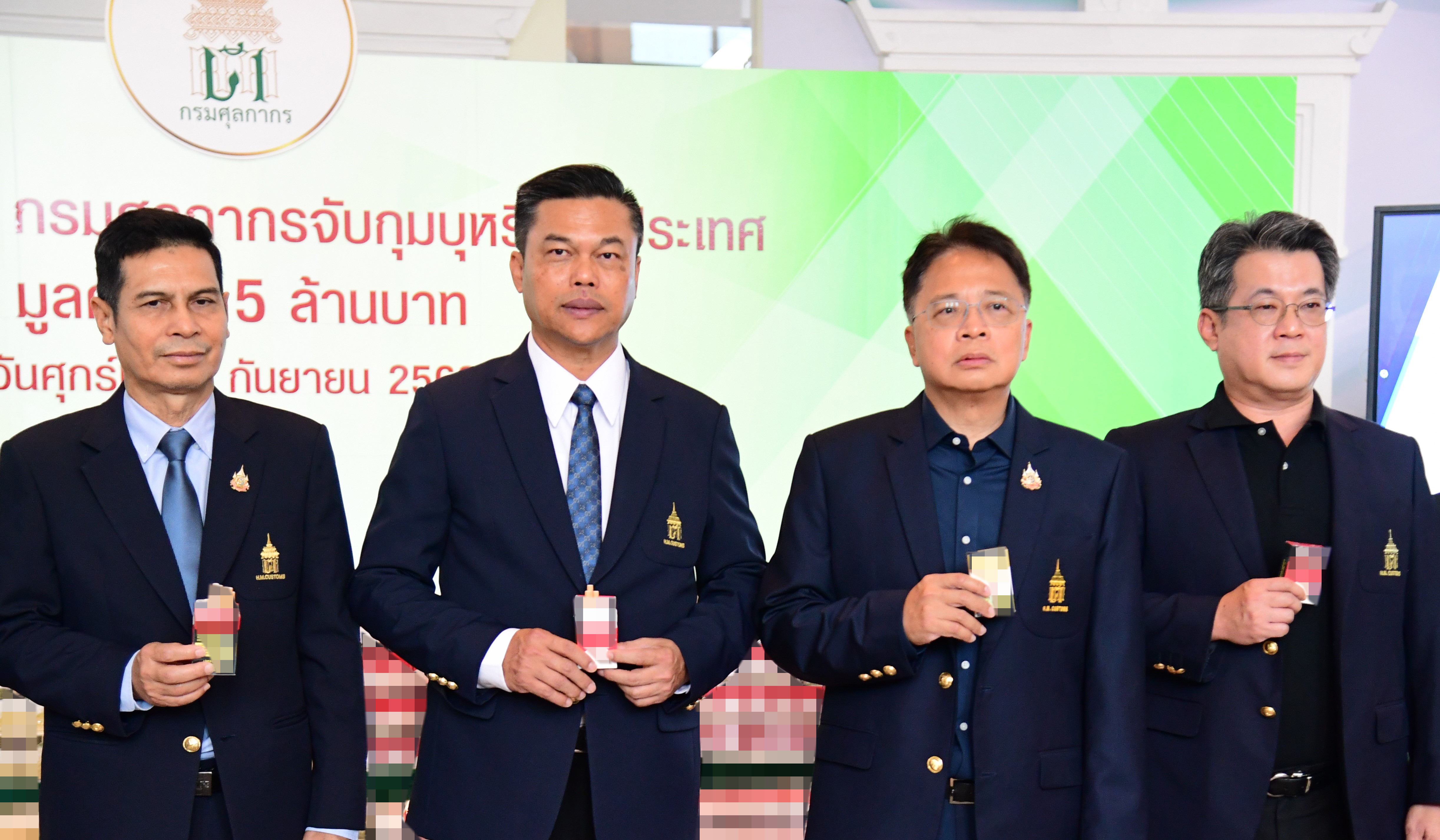 นายธีรัชย์ อัตนวานิช อธิบดีกรมศุลกากร พร้อมด้วยนายดิเรก คชารักษ์ รองอธิบดีกรมศุลกากร นายคณิต มีปิด รองอธิบดีกรมศุลกากร และคณะผู้บริหารกรมศุลกากร ร่วมแถลงผลการจับกุมบุหรี่ต่างประเทศละเมิดเครื่องหมายการค้า มูลค่าความเสียหายทางเศรษฐกิจ 215 ล้านบาท ณ ห้องโถง อาคาร 1 ชั้น 1 กรมศุลกากร (คลองเตย)