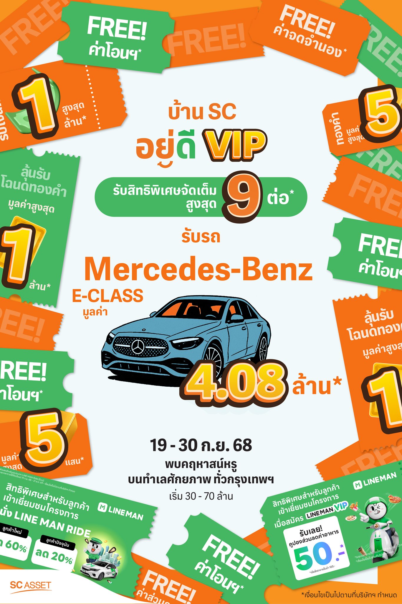 แคมเปญใหญ่ ‘บ้าน SC อยู่ดี VIP’ จัดเต็มสิทธิประโยชน์ครอบคลุมการอยู่อาศัยสูงสุด 9 ต่อ* ได้แก่ Mercedes-Benz E-Class มูลค่า 4.08 ล้านบาท*, รับเงินฝากสูงสุด 1 ล้านบาท*, ลุ้นรับโฉนดทองคำ มูลค่าสูงสุด 1 ล้านบาท*, ทองคำมูลค่าสูงสุด 500,000 บาท* อีกทั้งฟรี! ค่าส่วนกลาง*, ค่าจดจำนอง*, ค่าโอนกรรมสิทธิ์* และสำหรับลูกค้าที่เข้าเยี่ยมชมโครงการ รับโค้ดส่วนลดค่าอาหาร 50% จาก LINE MAN VIP* และโค้ดส่วนลดค่าเดินทางสูงสุด 60% จาก LINE MAN RIDE* (*เงื่อนไขเป็นไปตามที่บริษัทฯ กำหนด)