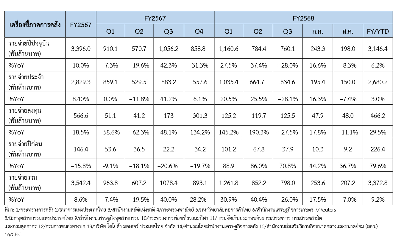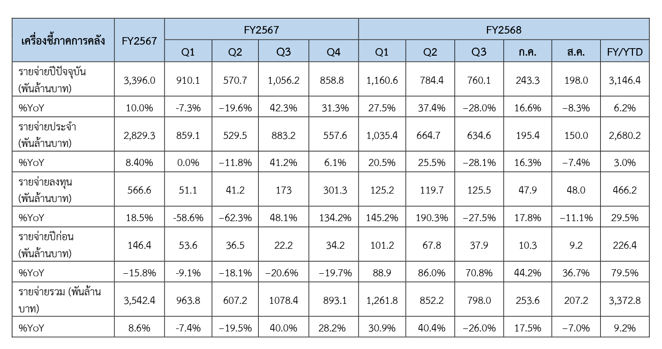 3. การใช้จ่ายงบประมาณหดตัว: โดยการเบิกจ่ายงบประมาณ ในเดือนสิงหาคม 2568 สามารถเบิกจ่ายได้รวมจำนวน 207.2 พันล้านบาท โดยเป็นการเบิกจ่ายจากงบประมาณปีปัจจุบันจำนวน 198.0 พันล้านบาท แบ่งเป็นการเบิกจ่ายรายจ่ายประจำ 150.0 พันล้านบาท และรายจ่ายลงทุน 48.0 พันล้านบาท และเป็นการเบิกจ่ายจากงบประมาณปีก่อน 9.2 พันล้านบาท ทำให้ในช่วง 11 เดือนแรกของปีงบประมาณ 2568 สามารถเบิกจ่ายได้รวมจำนวน 3,372.8 พันล้านบาท โดยเป็นการเบิกจ่ายจากงบประมาณปีปัจจุบันจำนวน 3,146.4 พันล้านบาท แบ่งเป็นการเบิกจ่ายรายจ่ายประจำ 2,680.2 พันล้านบาท และรายจ่ายลงทุน 466.2 พันล้านบาท และเป็นการเบิกจ่ายจากงบประมาณปีก่อน 226.4 พันล้านบาท