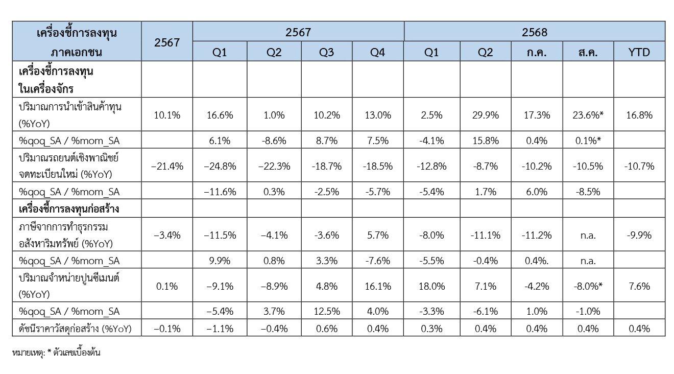 เครื่องชี้เศรษฐกิจด้านการลงทุนภาคเอกชน มีสัญญาณทรงตัวจากช่วงเดียวกันปีก่อน โดยการลงทุนภาคเอกชนในหมวดเครื่องมือเครื่องจักร สะท้อนจากปริมาณการนำเข้าสินค้าทุน (ตัวเลขเบื้องต้น) ในเดือนสิงหาคม 2568 เพิ่มขึ้นจากช่วงเดียวกันปีก่อนที่ร้อยละ 23.6 และเพิ่มขึ้นเมื่อเทียบกับเดือนก่อนหน้าหลังขจัดผลทางฤดูกาลที่ร้อยละ 0.1 ขณะที่ปริมาณรถยนต์เชิงพาณิชย์จดทะเบียนใหม่ ในเดือนสิงหาคม 2568 ลดลงจากช่วงเดียวกันปีก่อนที่ร้อยละ –10.5 และลดลงเมื่อเทียบกับเดือนก่อนหน้าหลังขจัดผลทางฤดูกาลที่ร้อยละ -8.5 สำหรับการลงทุนภาคเอกชนในหมวดการก่อสร้าง สะท้อนจากปริมาณจำหน่ายปูนซีเมนต์ภายในประเทศ (ตัวเลขเบื้องต้น) ในเดือนสิงหาคม 2568 ลดลงจากช่วงเดียวกันปีก่อนที่ร้อยละ -8.0 และลดลงเมื่อเทียบกับเดือนก่อนหน้าหลังขจัดผลทางฤดูกาลที่ร้อยละ -1.0