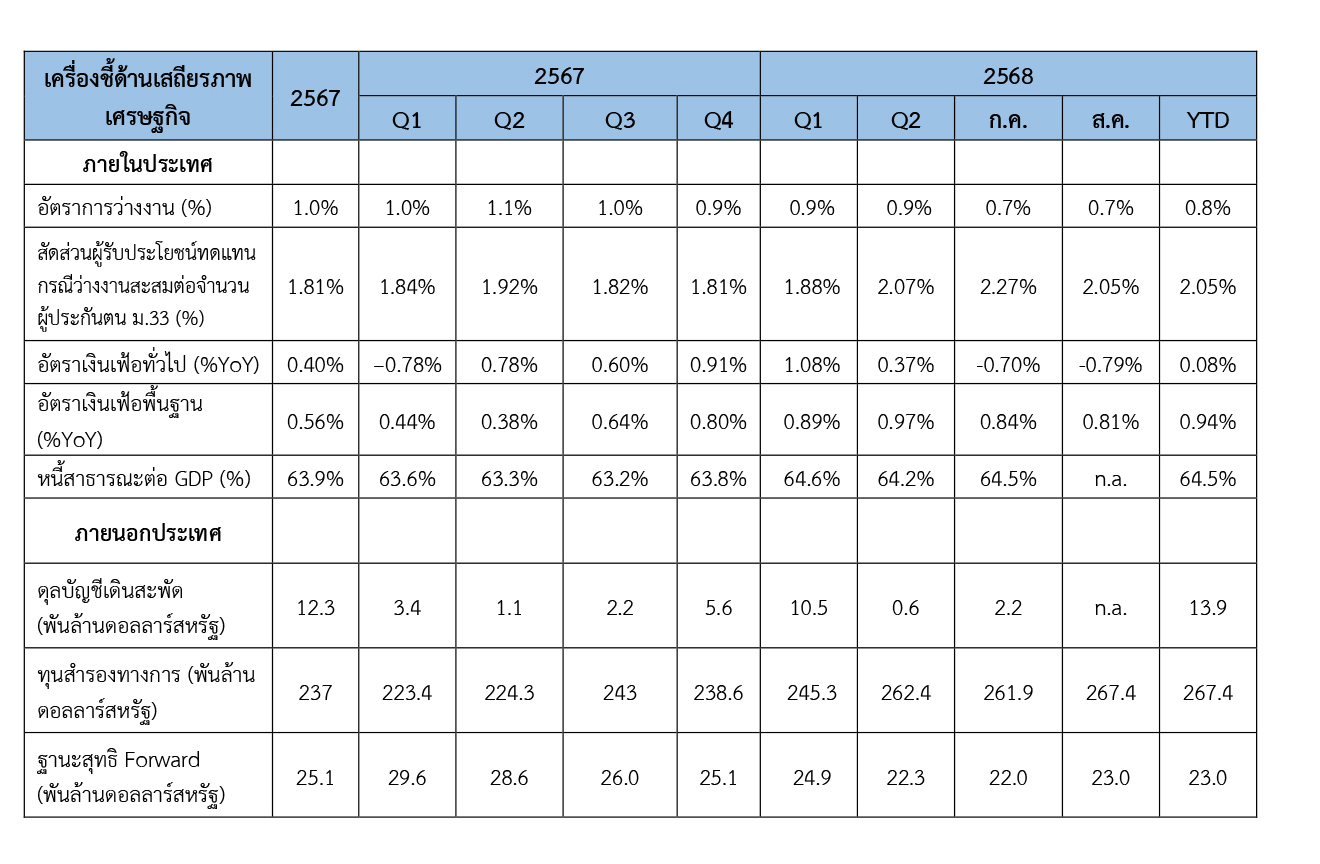 เสถียรภาพเศรษฐกิจยังอยู่ในเกณฑ์ดี: สะท้อนจากอัตราเงินเฟ้อทั่วไปในเดือนสิงหาคม 2568 อยู่ที่ร้อยละ -0.79 ขณะที่อัตราเงินเฟ้อพื้นฐานอยู่ที่ร้อยละ 0.81 ส่วนสัดส่วนหนี้สาธารณะ ณ สิ้นเดือนกรกฎาคม 2568 อยู่ที่ร้อยละ 64.5 ต่อ GDP ซึ่งยังอยู่ภายใต้กรอบวินัยการเงินการคลังที่ตั้งไว้ตามพระราชบัญญัติวินัยการเงินการคลังของรัฐ พ.ศ. 2561 สำหรับเสถียรภาพภายนอกยังอยู่ในระดับที่มั่นคง และสามารถรองรับความเสี่ยงจากความผันผวนของเศรษฐกิจโลกได้ สะท้อนจากทุนสำรองระหว่างประเทศ ณ สิ้นเดือนสิงหาคม 2568 ยังคงทรงตัวอยู่ในระดับสูงที่ 267.4 พันล้านดอลลาร์สหรัฐ