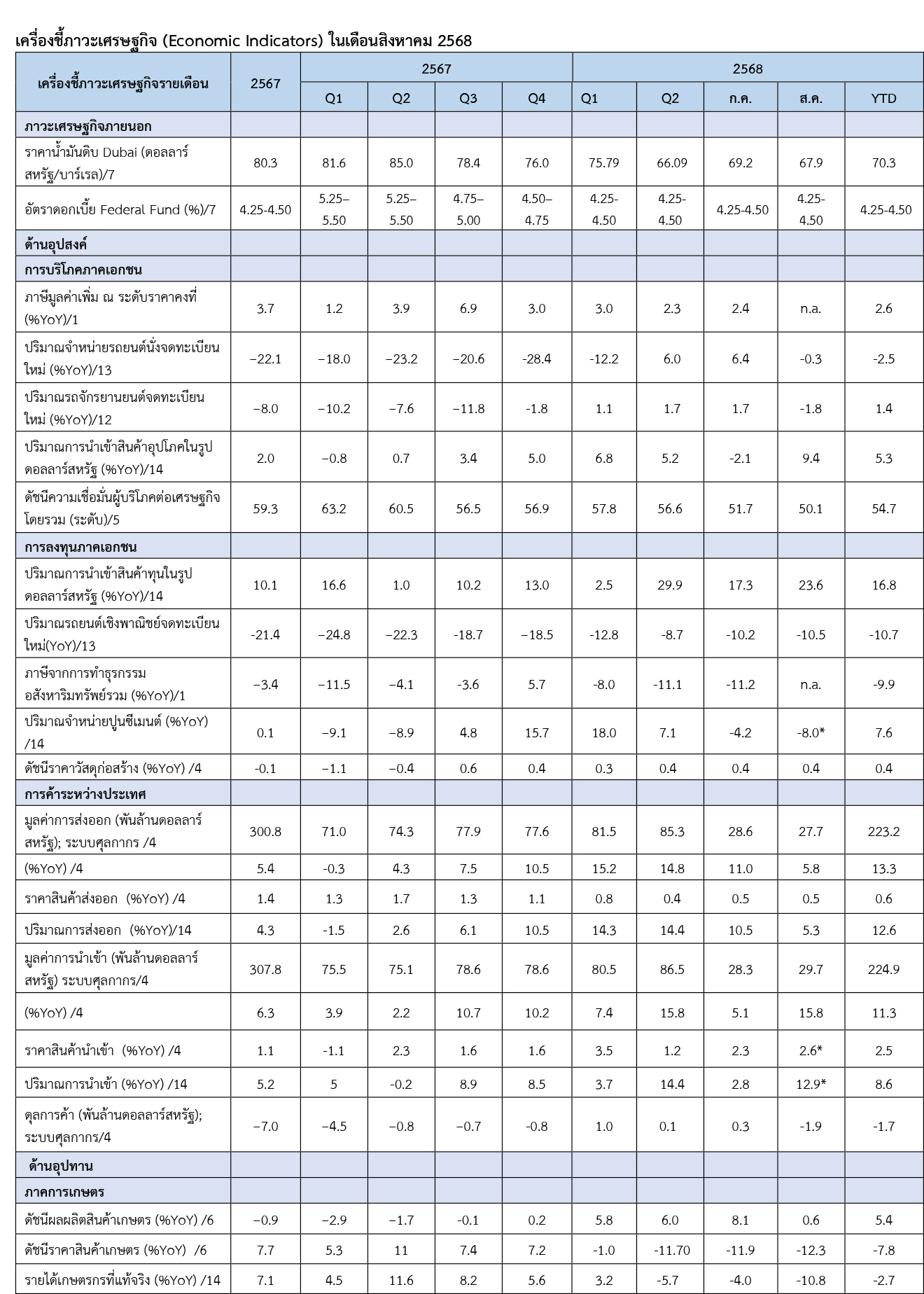 “สถานการณ์เศรษฐกิจไทยในเดือนสิงหาคม 2568 ได้รับปัจจัยสนับสนุนจากการส่งออกสินค้าและการท่องเที่ยวภายในประเทศที่ยังขยายตัว ขณะที่การบริโภคภาคเอกชนและจำนวนนักท่องเที่ยวต่างประเทศ ส่งสัญญาณชะลอตัว ทั้งนี้ ยังจำเป็นต้องติดตามผลกระทบของมาตรการภาษีศุลกากรตอบโต้ (Reciprocal Tariffs) ของสหรัฐฯ ทิศทางค่าเงินบาท นโยบายของรัฐบาล และความขัดแย้งในพื้นที่ชายแดนที่จะส่งผลกระทบต่อเศรษฐกิจไทยอย่างใกล้ชิดต่อไป”
