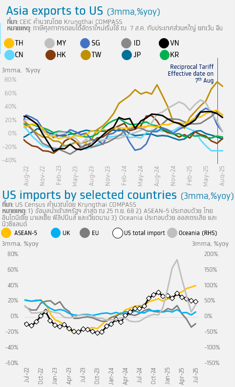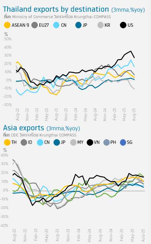 • Krungthai COMPASS มองโมเมนตัมของการเร่งส่งออกเแผ่วลงชัดเจนขึ้น สะท้อนจากการส่งออกเดือน ส.ค. ที่หดตัว 2.9%MoM ติดลบต่อเนื่อง 3 เดือน สอดคล้องกับบรรดาชาติเอเชียที่ต่างพึ่งพาตลาดสหรัฐฯ ซึ่งจะเผชิญกับการส่งออกไปยังตลาดดังกล่าวที่ลดลง ขณะที่สหรัฐฯ มีแนวโน้ม reallocate แหล่งนำเข้าสู่ประเทศที่ภาษีต่ำ นอกจากนี้ ผู้ส่งออกยังประสบปัญหาการแย่งตลาดทดแทนสหรัฐฯ รวมถึงอุปสงค์ในตลาดโลกที่แผ่วลงตามทิศทางการชะลอตัวของเศรษฐกิจโลก