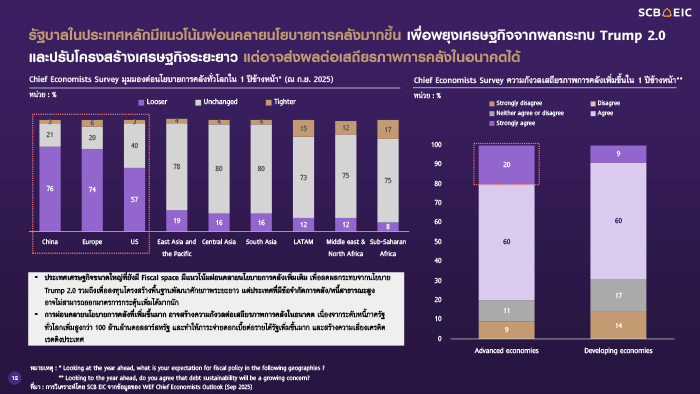 นโยบายการคลังและนโยบายการเงินจะมีบทบาทพยุงเศรษฐกิจโลกมากขึ้น โดยเฉพาะเศรษฐกิจหลัก เช่น จีนขาดดุลงบประมาณสูงขึ้นมาก ยุโรปคลายข้อจำกัดทางการคลังเพื่อเพิ่มงบประมาณแก้ปัญหาเศรษฐกิจ อย่างไรก็ดี การขาดดุลการคลังอาจเพิ่มความเสี่ยงทางการคลังที่มีอยู่ก่อนแล้วในหลายประเทศ สำหรับนโยบายการเงิน นับตั้งแต่ต้นปี 2568 ธนาคารกลางสหรัฐฯ ลดดอกเบี้ยแล้ว 25 bps และมีแนวโน้มลดเพิ่มอีก 100 bps ในช่วงที่เหลือของปี 2568 – ปี 2569 เพื่อพยุงตลาดแรงงานที่แย่ลงเร็ว แม้ยังมีความเสี่ยงเงินเฟ้อจากกำแพงภาษีนำเข้า ด้านธนาคารกลางจีนลดดอกเบี้ยแล้ว 10 bps และมีแนวโน้มลดอีก 30 bps ควบคู่กับมาตรการการเงินเจาะจงภาคบริการและการผลิตขั้นสูง ด้านธนาคารกลางยุโรปจะลดดอกเบี้ยอีก 25 bps หลังจากปรับลดต่อเนื่องรวม 100 bps และจะสิ้นสุดวัฏจักรดอกเบี้ยขาลงรอบนี้ ขณะที่ธนาคารกลางญี่ปุ่นขึ้นดอกเบี้ย 25 bps ในช่วงต้นปี และมีแนวโน้มปรับขึ้นรวม 50 bps ในปี 2570 หลังผลกระทบภาษีทรัมป์, ปัจจัยการเมือง และผลการเจรจาค่าจ้างชัดเจนขึ้น