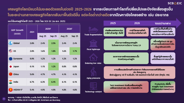 SCB EIC ประเมินเศรษฐกิจโลกในช่วงที่เหลือของปีนี้ และปี 2569 จะได้รับผลกระทบจากนโยบาย Trump 2.0 มากขึ้น เศรษฐกิจโลกมีแนวโน้มขยายตัว 2.5% ในปี 2568 และ 2.4% ปี 2569 ชะลอลงจาก 2.8% ในปีก่อน ผลจากสงครามการค้า แม้เศรษฐกิจโลกปรับดีขึ้นบ้างจากมุมมองช่วงกลางปี ตามการเจรจาการค้ากับสหรัฐฯ ที่คืบหน้าและการเร่งผลิตส่งออกก่อนภาษีตอบโต้ของสหรัฐฯ ประกาศใช้ นอกจากนี้ เศรษฐกิจโลกยังเผชิญความไม่แน่นอนสูง แม้สหรัฐฯ ประกาศใช้อัตราศุลกากรตอบโต้รายประเทศ (Reciprocal tariff) แล้ว แต่สหรัฐฯ มีแนวโน้มจะใช้ศุลกากรเฉพาะสินค้า (Sectoral tariff) และศุลกากรสินค้าสวมสิทธิ (Tariff on transshipped goods) เป็นอาวุธเชิงยุทธศาสตร์ต่อเนื่อง ซึ่งยังมีรายละเอียดไม่ชัดเจน