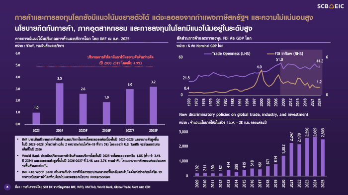 ทั้งนี้กำแพงภาษีสหรัฐฯ ยิ่งเร่งให้เศรษฐกิจโลกแบ่งขั้ว (Decoupling) และมีแนวโน้มกดดันการค้าการลงทุน โดยเฉพาะการค้าระหว่างขั้ว มองไปข้างหน้ากิจกรรมเศรษฐกิจโลกจะถูกขับเคลื่อนจากกระแสการลงทุนในอุตสาหกรรมยุทธศาสตร์ เช่น ดิจิทัล เทคโนโลยี AI และพลังงานสะอาด ทิศทางการกระจายความเสี่ยงออกจากจีน (China +1) การย้ายฐานการผลิตสู่ประเทศที่มีความเสี่ยงภูมิรัฐศาสตร์ต่ำกว่า ประเทศใกล้เคียง หรือประเทศพันธมิตร (Nearshoring and Friendshoring) รวมถึงการเพิ่มการลงทุนและย้ายฐานการผลิตกลับสหรัฐฯ (Reshoring) ส่วนหนึ่งเป็นผลจากข้อตกลงการค้ากับสหรัฐฯ