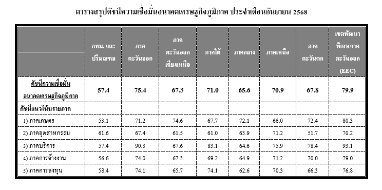 “ดัชนีความเชื่อมั่นอนาคตเศรษฐกิจภูมิภาคประจำเดือนกันยายน 2568 สะท้อนแนวโน้มเศรษฐกิจภูมิภาคในระยะ 6 เดือนข้างหน้าที่ยังขยายตัวได้ โดยเฉพาะในภาคตะวันออกและภาคใต้ เป็นผลจากแนวโน้มเศรษฐกิจในภาคเกษตรและภาคอุตสาหกรรมที่ปรับตัวดีขึ้น ทั้งนี้ ควรติดตามประเด็นสภาพอากาศที่แปรปรวน ความผันผวนของเศรษฐกิจและการค้าโลก และความคืบหน้าของมาตรการกระตุ้นเศรษฐกิจของรัฐบาล”