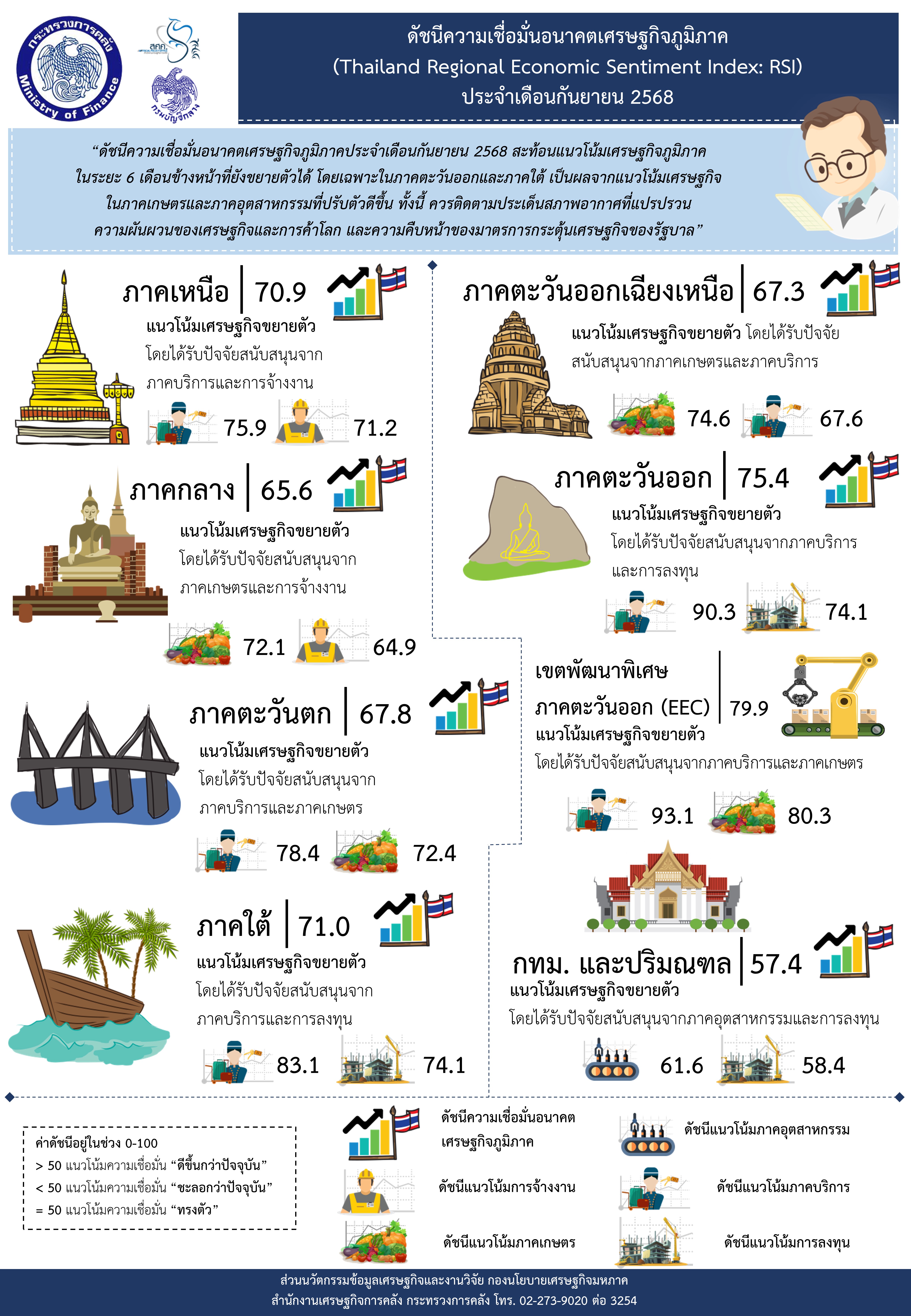 นายพรชัย ฐีระเวช ผู้อำนวยการสำนักงานเศรษฐกิจการคลัง ในฐานะโฆษกกระทรวงการคลังเปิดเผย ดัชนีความเชื่อมั่นอนาคตเศรษฐกิจภูมิภาคประจำเดือนกันยายน 2568 จากการประมวลผลข้อมูลการสำรวจภาวะเศรษฐกิจรายจังหวัดจากสำนักงานคลังจังหวัด 76 จังหวัดทั่วประเทศ และสภาอุตสาหกรรมแห่งประเทศไทยเพื่อจัดทำดัชนีความเชื่อมั่นอนาคตเศรษฐกิจภูมิภาคพบว่า “ดัชนีความเชื่อมั่นอนาคตเศรษฐกิจภูมิภาคประจำเดือนกันยายน 2568 สะท้อนแนวโน้มเศรษฐกิจภูมิภาคในระยะ 6 เดือนข้างหน้าที่ยังขยายตัวได้ โดยเฉพาะในภาคตะวันออกและภาคใต้ เป็นผลจากแนวโน้มเศรษฐกิจในภาคเกษตรและภาคอุตสาหกรรมที่ปรับตัวดีขึ้น ทั้งนี้ ควรติดตามประเด็นสภาพอากาศที่แปรปรวน ความผันผวนของเศรษฐกิจและการค้าโลก และความคืบหน้าของมาตรการกระตุ้นเศรษฐกิจของรัฐบาล” โดยมีรายละเอียดดังต่อไปนี้