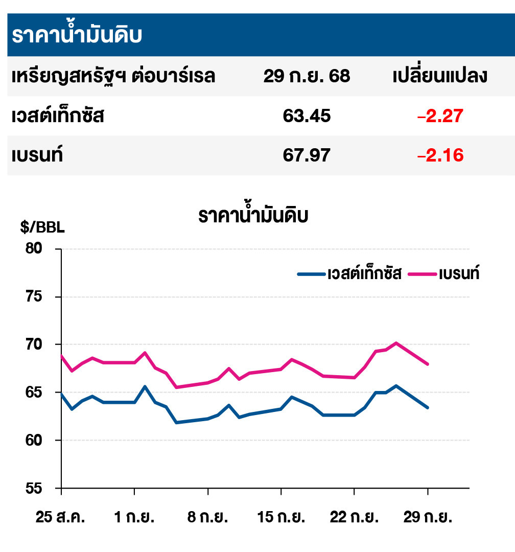 (-) ราคาน้ำมันดิบปรับตัวลดลง หลังกลุ่มโอเปก (OPEC+) จะมีการประชุมร่วมกันในวันอาทิตย์นี้ และมีแนวโน้มที่จะเพิ่มกำลังการผลิตเพิ่มเติมอย่างน้อย 137,000 บาร์เรลต่อวัน ในเดือน พ.ย. 68 เพื่อเพิ่มส่วนแบ่งการตลาด