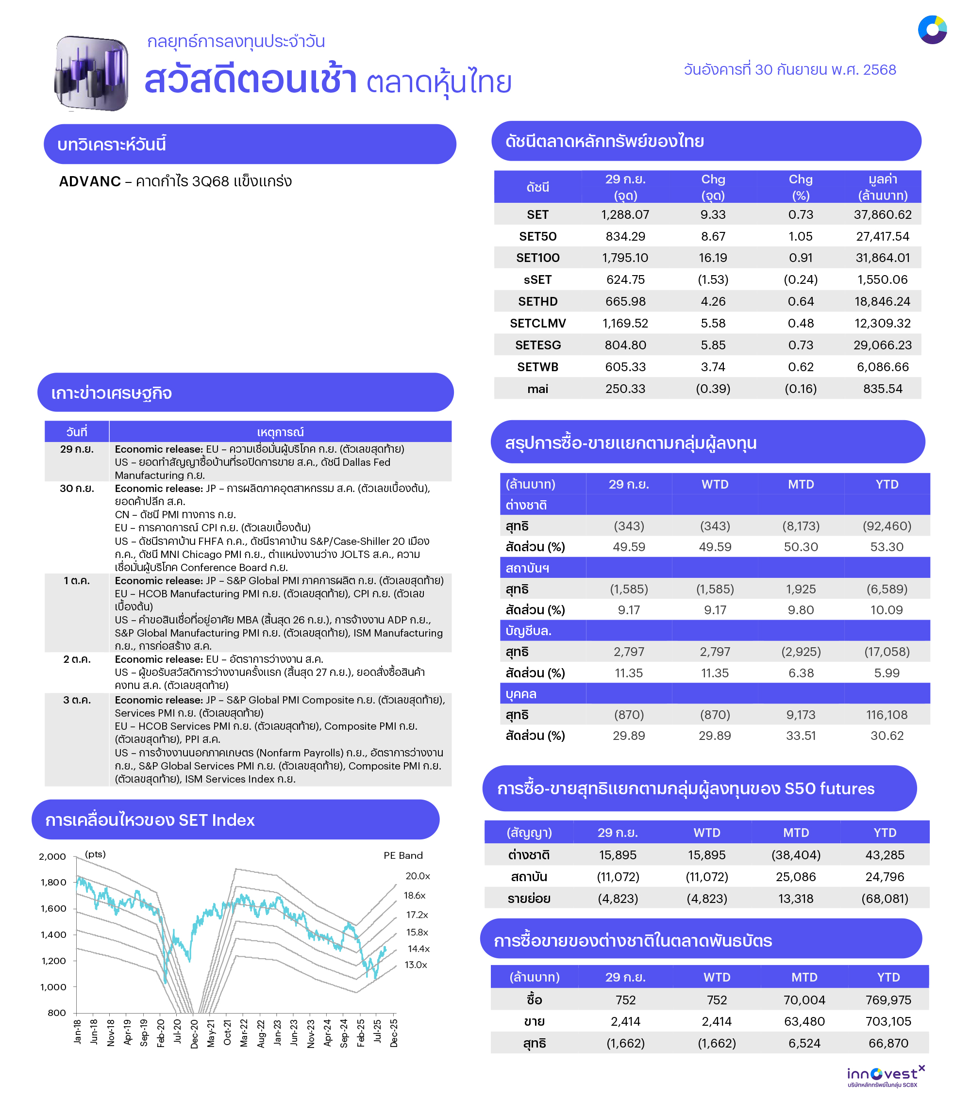 • นายกฯ อนุทินแถลงนโยบายเร่งแก้ปัญหา 5 ด้าน 15 นโยบายสำคัญภายใน 4 เดือน ด้านเศรษฐกิจจะเน้นลดค่าครองชีพ-เพิ่มกำลังซื้อ, แก้หนี้รายย่อย-หนุนสภาพคล่อง SMEs, เปิดโอกาสออมผ่านพันธบัตร และฟื้นท่องเที่ยว มองเป็นบวกต่อ SET โดยเฉพาะกลุ่มค้าปลีก (CPAXT BJC TNP CPALL) สินค้าอุปโภคบริโภค (CBG OSP HTC ICHI SAPPE) ท่องเที่ยว (AOT CENTEL ERW AWC MINT) กลุ่มไฟแนนซ์เป็นบวกต่อสินเชื่อ (MTC SAWAD TIDLOR)
