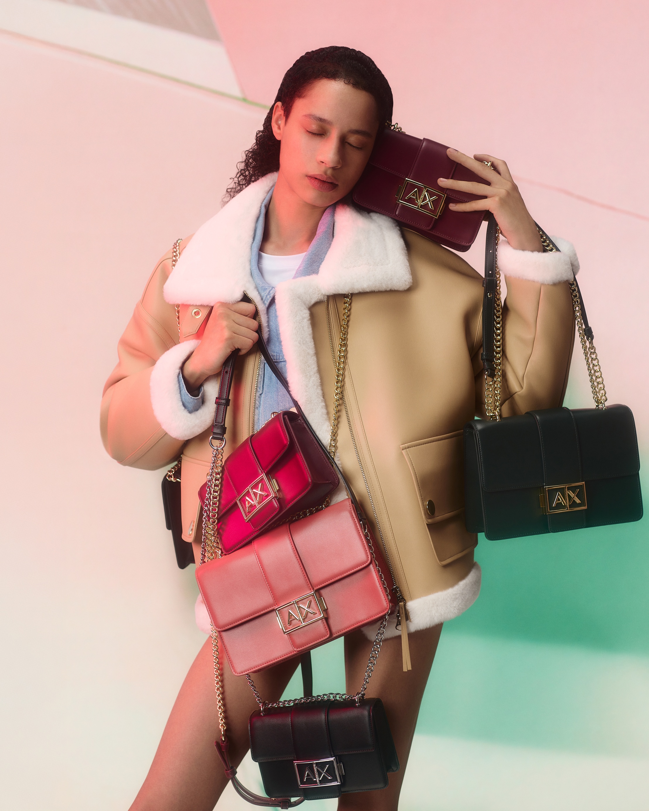 โดยคอลเลกชันนี้โดดเด่นด้วยสายสะพายโซ่ และโลโก้โลหะด้านหน้าตัวอักษณ AX สัญญาลักษณ์ไอคอนนิกของแบรนด์ พร้อมวัสดุหนังเพิ่มความหรูหราให้กับกระเป๋า