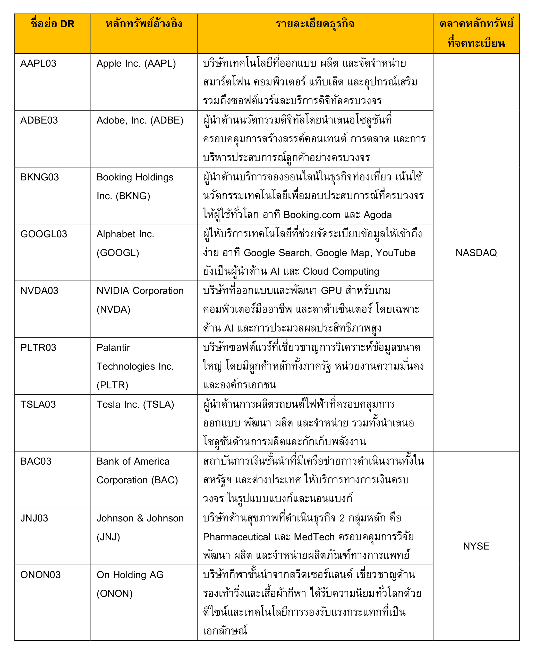 ตลาดหลักทรัพย์แห่งประเทศไทย รับจดทะเบียน DR 10 หลักทรัพย์ใหม่ อ้างอิงหุ้นชั้นนำในตลาดหลักทรัพย์แนสแด็ก (NASDAQ) และตลาดหลักทรัพย์นิวยอร์ก (NYSE) สหรัฐอเมริกา ออกโดย บริษัทหลักทรัพย์ พาย จำกัด (มหาชน) (PI) เริ่มซื้อขายในตลาดหลักทรัพย์ไทย 1 ตุลาคม 2568 นี้