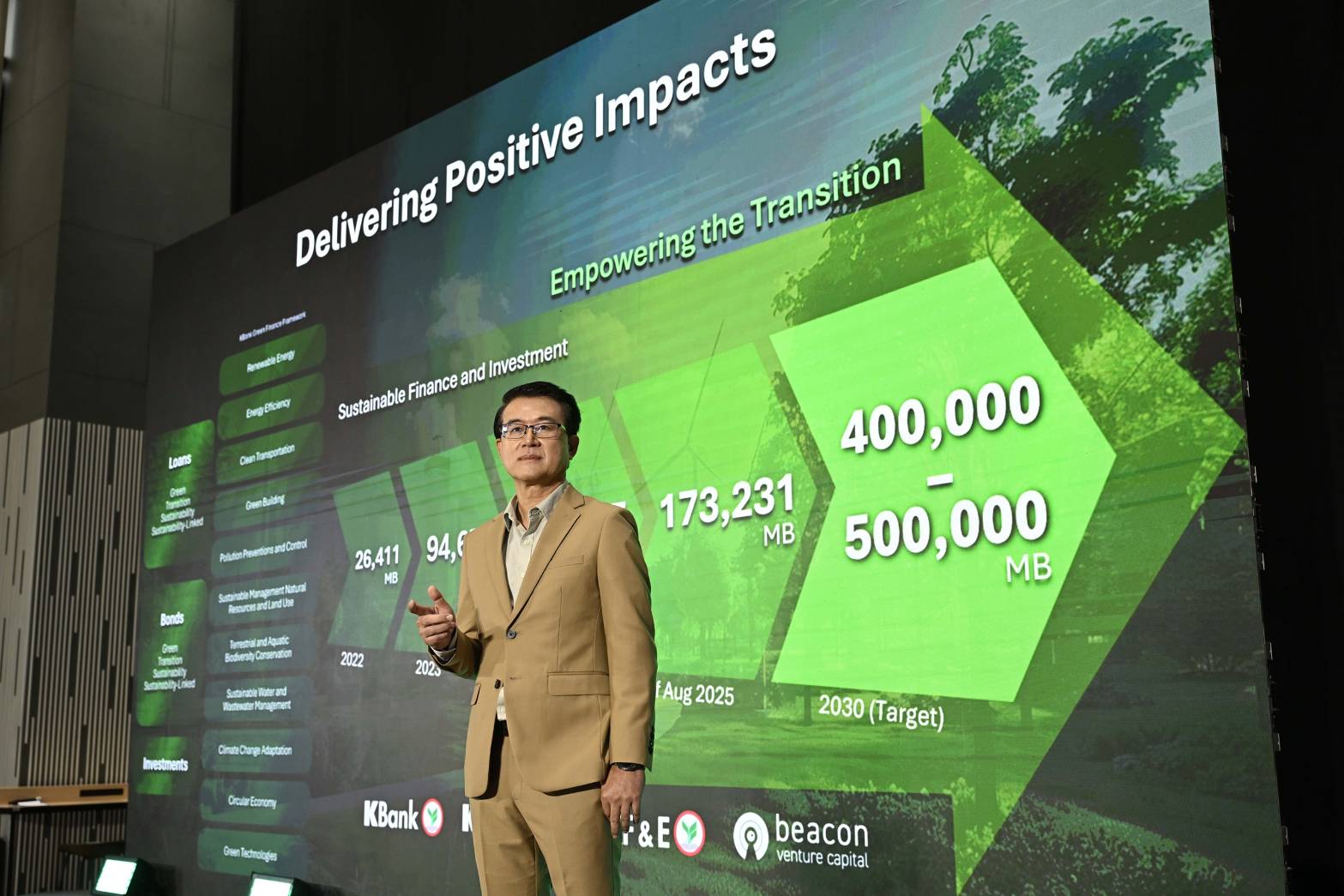 ธนาคารได้ปรับเป้าหมายสินเชื่อและเงินลงทุนเพื่อความยั่งยืน เป็น 4-5 แสนล้านบาท ภายในปี 2573 (ค.ศ.2030) เพื่อเร่งการเปลี่ยนผ่านสู่เศรษฐกิจคาร์บอนต่ำอย่างมีประสิทธิภาพ ตลอดจนมุ่งมั่นพัฒนา Beyond Banking Solution เพื่อส่งมอบ Climate Solution ที่จะช่วยเสริมสร้างศักยภาพให้แก่ลูกค้า และส่งเสริมการสร้าง Carbon Ecosystem ที่ครอบคลุมทุกมิติของการแก้ไขปัญหาสภาพภูมิอากาศ ได้แก่ การเป็นที่ปรึกษาด้านความยั่งยืนและการลดการปล่อยก๊าซเรือนกระจกสำหรับภาคธุรกิจที่ต้องการปรับตัว พร้อมพัฒนาเครื่องมือ KClimate1.5 สำหรับการจัดทำบัญชีก๊าซเรือนกระจก การจัดตั้ง Creative Climate Research Center เป็นศูนย์กลางองค์ความรู้และความร่วมมือเพื่อรับมือกับปัญหาโลกร้อน การริเริ่มโครงการต่างๆ เพื่อสร้าง Carbon Ecosystem ในสังคม เช่น Watt’s Up แพลตฟอร์มสำหรับรถมอเตอร์ไซค์ไฟฟ้า แพลตฟอร์ม Green Pass สำหรับการขอใบรับรอง RECs และแพลตฟอร์ม K-GreenSpace ที่ช่วยให้ลูกค้าเข้าถึงโซลูชัน Green Living ได้ง่ายขึ้น