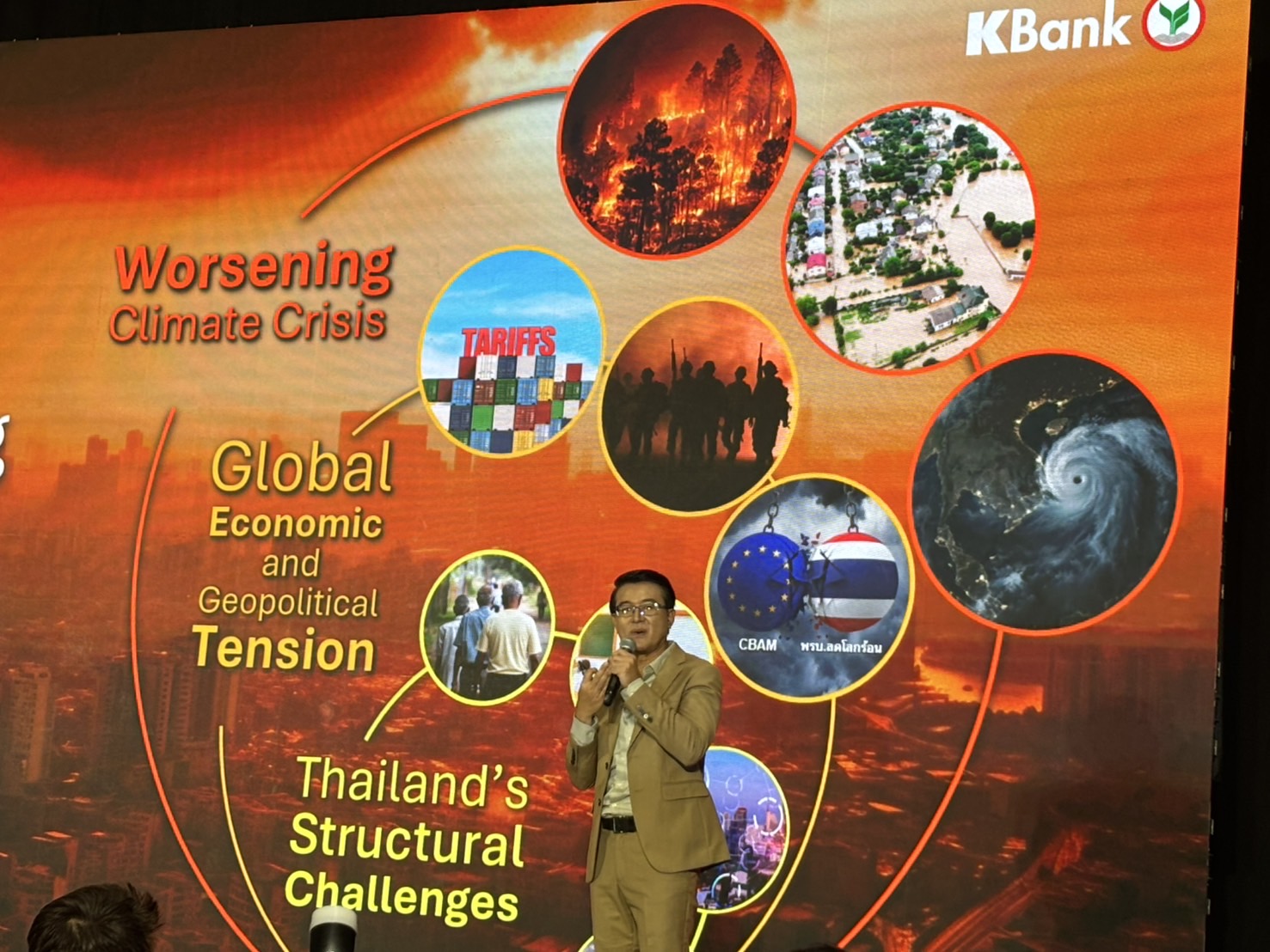 นายจงรัก รัตนเพียร ผู้จัดการใหญ่ ธนาคารกสิกรไทย เปิดเผยว่า ความท้าทายที่ประเทศไทยกำลังเผชิญ มีทั้งปัจจัยภายในประเทศที่เป็นปัญหาเชิงโครงสร้างซึ่งส่งผลต่อศักยภาพในการแข่งขัน อาทิ หนี้สาธารณะและหนี้ครัวเรือนที่ยังอยู่ในระดับสูง ความขัดแย้งด้านภูมิรัฐศาสตร์และสงครามการค้า การเปลี่ยนแปลงด้านสภาพภูมิอากาศ ซึ่งรวมถึงมาตรการทางการค้าจากประเทศคู่ค้าสำคัญ อาทิ EU CBAM ที่จะเริ่มเก็บค่าธรรมเนียมคาร์บอนตั้งแต่ปี 2569 เป็นต้นไป ที่คาดว่าจะส่งผลกระทบต่อการส่งออกของไทยเพิ่มมากขึ้น จากปัจจุบันครอบคลุมมูลค่าสินค้า 1.1 หมื่นล้านบาท เป็นราว 2.8 หมื่นล้านบาท ภายในปี 2573 ดังนั้นธุรกิจที่ปรับตัวได้ก่อนจะสร้างความได้เปรียบ