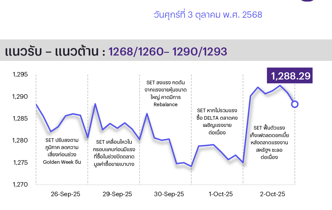 คาดตลาดแกว่งตัวไซด์เวย์ในกรอบ NFP สหรัฐฯ ในคืนนี้คาดว่ายังไม่สามารถรายงานได้ในช่วงปิดหน่วยงานราชการ ตลาดคงคาดว่าภาคแรงงานสหรัฐฯ ยังแย่ตามตัวเลข ADP ที่ออกไปก่อนหน้า แม้เป็นสัญญาณลดดอกเบี้ยเฟดหนุนเงินไหลเข้า แต่นักลงทุนต่างชาติกลับมาขายสุทธิวันก่อน ทำให้ยังระมัดระวัง ทางเทคนิคตลาดยังแกว่งตัวในกรอบ ยังไม่สามารถยืนเหนือแนวต้าน 1290-1293 ได้ การยืนเหนือได้จึงจะเป็นสัญญาณบวก ส่วนการลงมีกรอบล่างที่ 1268 รอเบรก