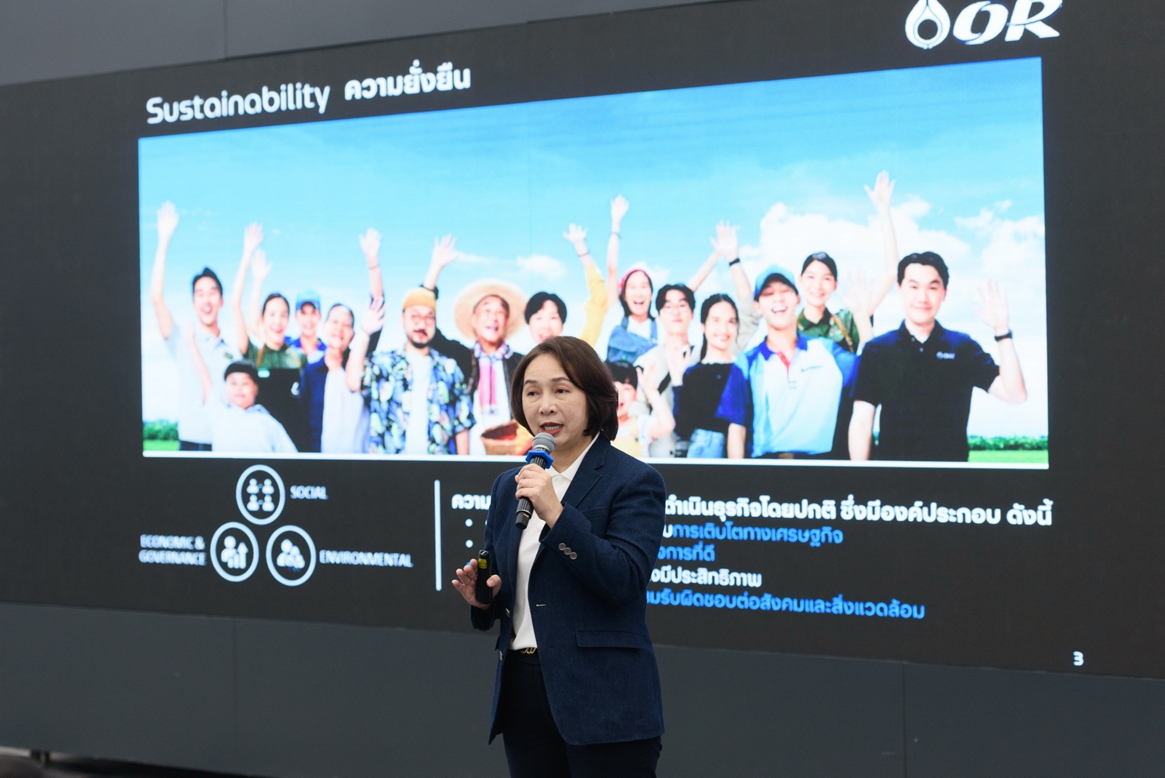 นางสาววรรณวิสาข์ สู่ศุภอรรถ ผู้จัดการฝ่ายบริหารความยั่งยืน และคุณภาพ ความปลอดภัย อาชีวอนามัย และสิ่งแวดล้อม บริษัท ปตท.น้ำมันและการค้าปลีก จำกัด (มหาชน) กล่าวถึงแนวทางขับเคลื่อนองค์กรสู่การเติบโตอย่างยั่งยืน ด้วยวิสัยทัศน์ “Empowering All toward Inclusive Growth” โดยกำหนด 3 เป้าหมายด้านความยั่งยืนภายในปี 2573 ได้แก่ Living Community (ยกระดับคุณภาพชีวิตชุมชนมากกว่า 17,000 ชุมชน) Healthy Environment (ลดผลกระทบด้านสิ่งแวดล้อมจากการดำเนินธุรกิจให้มากกว่า 1 ใน 3) และ Economic Prosperity (สร้างการเติบโตทางเศรษฐกิจให้กับผู้มีส่วนได้เสียมากกว่า 1 ล้านราย) โดย OR ตั้งเป้าหมายความเป็นกลางทางคาร์บอน (Carbon Neutrality) ภายในปี 2573 และการปล่อยคาร์บอนสุทธิเป็นศูนย์ (Net Zero) ภายในปี 2593 ผ่านแผน 3R ได้แก่ Reduce ลดการปล่อยก๊าซเรือนกระจกจากกิจกรรมขององค์กร Remove กำจัดคาร์บอนส่วนเกินผ่านการปลูกป่าและจัดทำโครงการคาร์บอนเครดิต Reinforce เสริมสร้างพอร์ตการลงทุนสีเขียว เช่น สถานีอัดประจุไฟฟ้าสำหรับยานยนต์ (EV Charging Station) เป้าหมาย 7,000 จุด ติดตั้งโซลาร์รูฟท็อป และการจำหน่ายเชื้อเพลิงอากาศยานยั่งยืน (SAF)