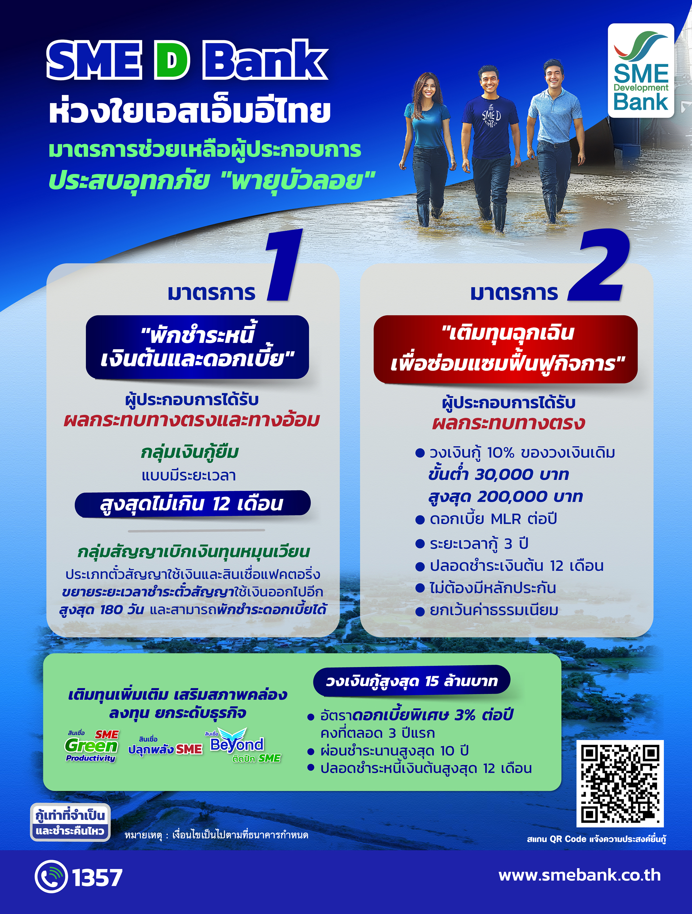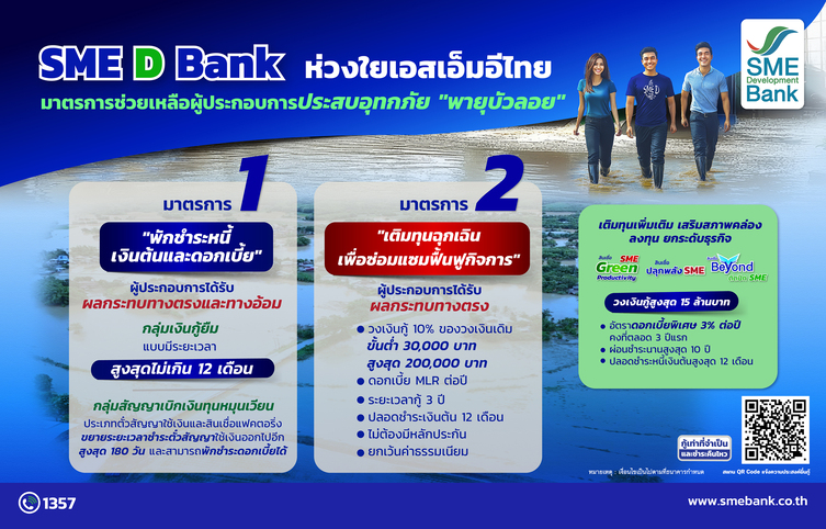 SME D Bank ออกมาตรการเร่งด่วน ช่วยเหลือผู้ประกอบการเอสเอ็มอีได้รับผลกระทบจากอิทธิพลพายุ “บัวลอย” ในพื้นที่ 18 จังหวัด ตามรายงานกรมป้องกันและบรรเทาสาธารณภัย ให้สิทธิ์พักชำระหนี้เงินต้นและดอกเบี้ย สูงสุดไม่เกิน 12 เดือน ช่วยลดภาระทางการเงิน ควบคู่เติมทุนฉุกเฉิน ซ่อมแซมฟื้นฟูให้กิจการกลับมาเดินหน้าได้โดยเร็ว