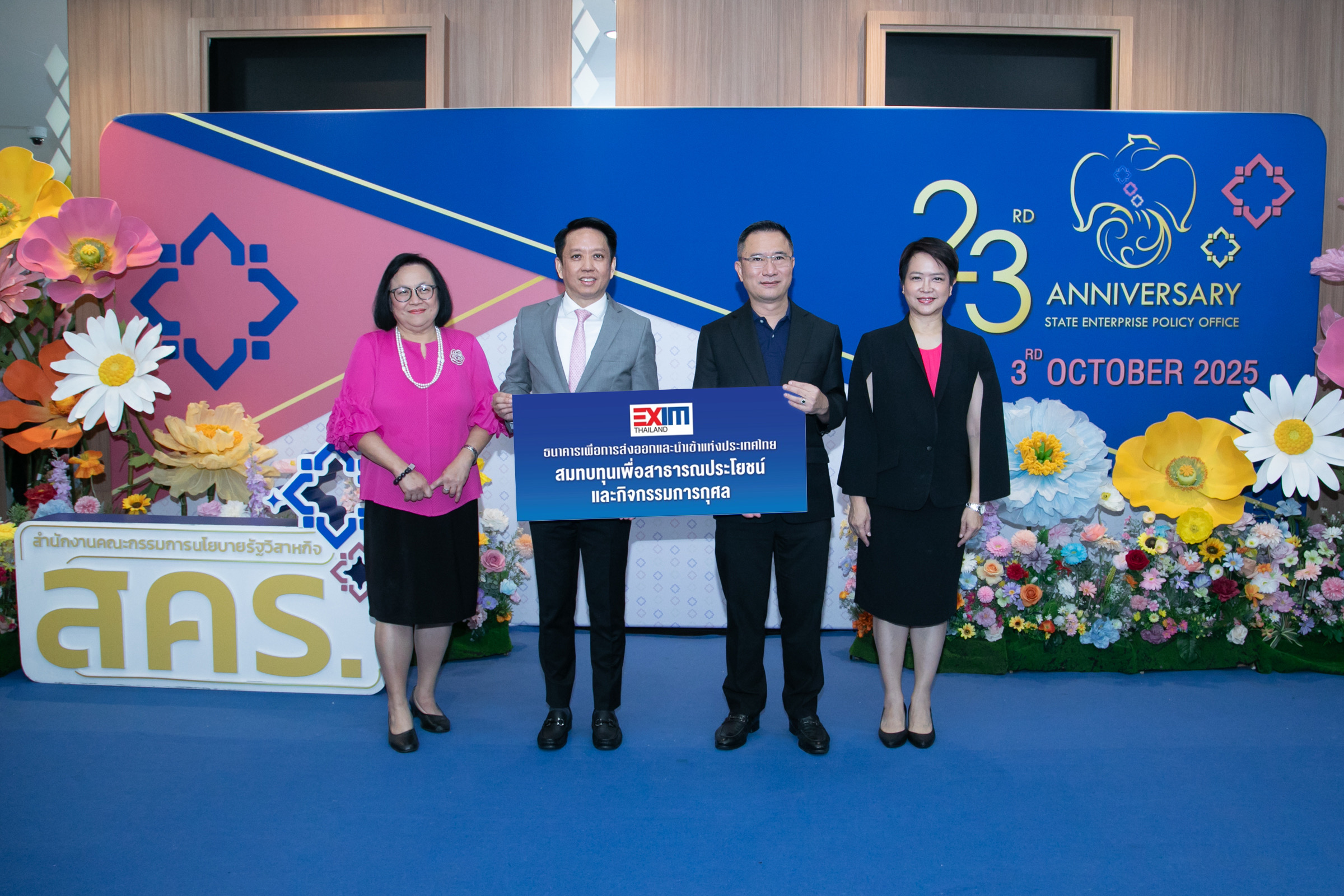 นายชลัช รัตนบุญนิธิ กรรมการผู้จัดการ ธนาคารเพื่อการส่งออกและนำเข้าแห่งประเทศไทย (EXIM BANK) ร่วมแสดงความยินดีกับนายธิบดี วัฒนกุล ผู้อำนวยการสำนักงานคณะกรรมการนโยบายรัฐวิสาหกิจ (สคร.) พร้อมมอบเงินสมทบทุนสวัสดิการ สคร. ในโอกาสวันคล้ายวันสถาปนา สคร. ครบรอบ 23 ปี ณ กระทรวงการคลัง เมื่อวันที่ 3 ตุลาคม 2568