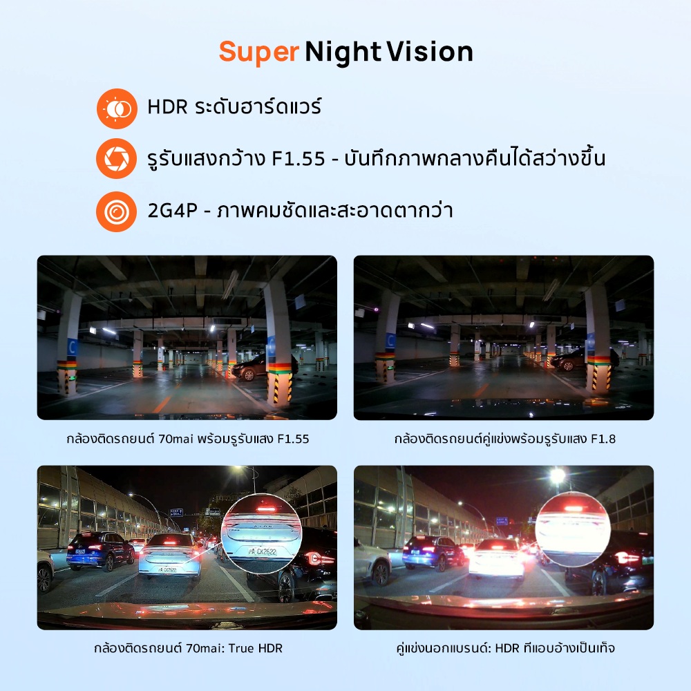 กล้องติดรถยนต์ 70mai A410 มาพร้อมรูรับแสงกว้างพิเศษ F1.55 และระบบ HDR ระดับฮาร์ดแวร์ มอบประสิทธิภาพการถ่ายภาพในสภาพแสงน้อยได้อย่างยอดเยี่ยม พร้อมปรับสมดุลแสงในสถานการณ์ที่ท้าทาย เช่น การขับขี่ผ่านอุโมงค์ ถนนย้อนแสง หรือเวลากลางคืน ด้วยอัลกอริทึมปรับแต่งภาพเฉพาะ ทุกเฟรมจึงได้รับการปรับแต่งเพื่อความคมชัดสูงสุดและความแม่นยำของสีอย่างไร้ที่ติ