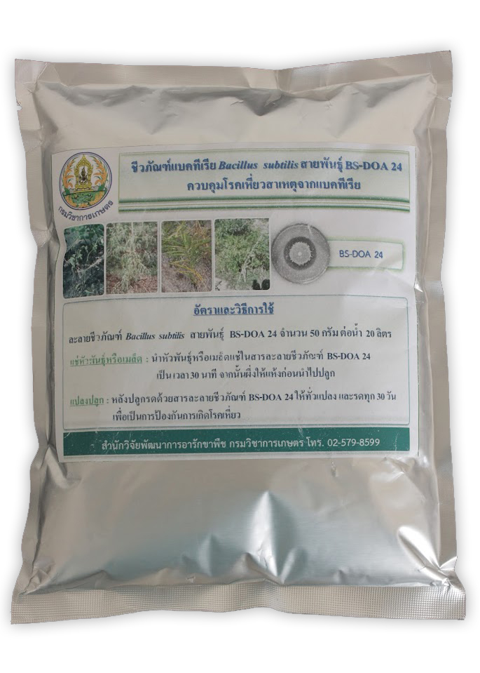 ชีวภัณฑ์แบคทีเรียบาซิลลัส ซับทีลีส สายพันธุ์ BS-DOA24 (Bacillus subtilis BS-DOA24) ใช้ป้องกันกำจัดโรคเหี่ยวที่เกิดจากแบคทีเรียราลสโทเนีย โซลานาเซียรัม (Ralstonia solanacearum) พืชตระกูลมะเขือ เช่น มะเขือเทศ พริก มันฝรั่ง มะเขือยาว มะเขือเปราะ และ พืชตระกูลขิง เช่น ขิง ขมิ้น ข่า ไพล ปทุมมา