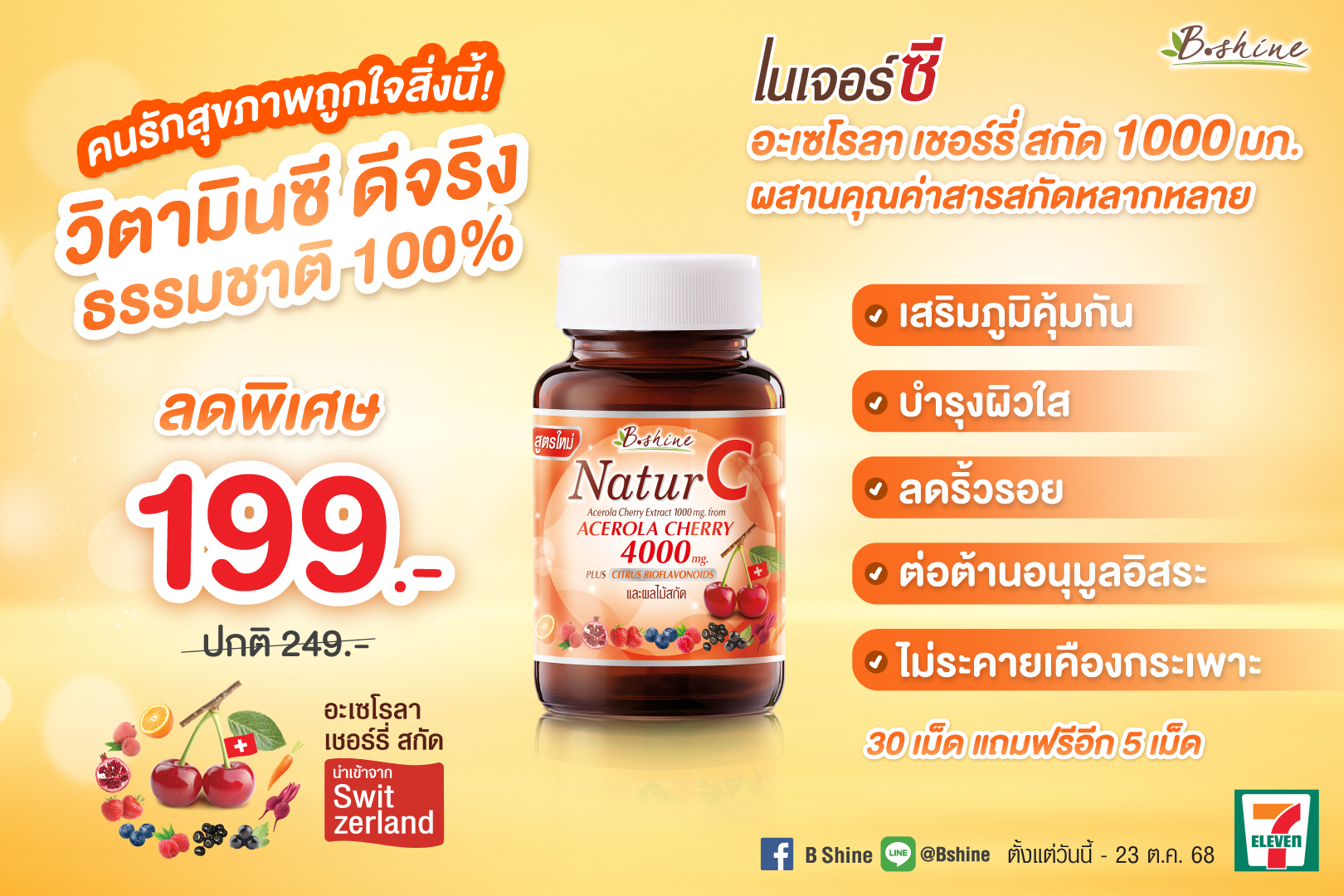 บีไชน์ เนเจอร์ซี อะเซโรลา เชอร์รี่ 1000 มก. สูตรใหม่ ให้วิตามินซีจากผลอะเซโรลาเชอร์รี่สด 4000 มก. เข้มข้นถึง 4 เท่า ช่วยเสริมภูมิคุ้มกัน เป็นวิตามินซีจากธรรมชาติ 100% ร่างกายจึงดูดซึมได้ดีกว่า อ่อนโยน ไม่ระคายเคืองกระเพาะ และมีซิตรัสไบโอฟลาโวนอยด์สูง ช่วยเพิ่มการดูดซึมวิตามินซีได้มากกว่า พร้อมด้วยสารสกัดจากทับทิมถึง 70 มก. บำรุงผิวให้กระจ่างใส สารสกัดจากเมล็ดลิ้นจี่ ช่วยให้ผิวกระชับ ลดริ้วรอย มิกซ์แคโรทีนอยด์ ช่วยปกป้องผิวจากแสงแดด และเบอร์รี่มิกซ์ 6 ชนิด บำรุงดวงตาให้สดใส ประโยชน์ครบในเม็ดเดียวเสริมภูมิคุ้มกัน ลดโอกาสการติดหวัด ลดอาการภูมิแพ้ ฟื้นฟูผิว บำรุงผิวพรรณให้สวยสดใส ลดริ้วรอย และต้านอนุมูลอิสระ แบบขวด 30 เม็ด (แถมฟรีอีก 5 เม็ด) มีโปรโมชั่นพิเศษ! เพียง 199 บาท จากราคาปกติ 249 บาท และสมาชิก All Member รับ 1 เหรียญ หาซื้อได้ที่ร้านเซเว่น อีเลฟเว่น ทุกสาขาทั่วประเทศ ตั้งแต่วันนี้ – 23 ตุลาคม 2568 เท่านั้น