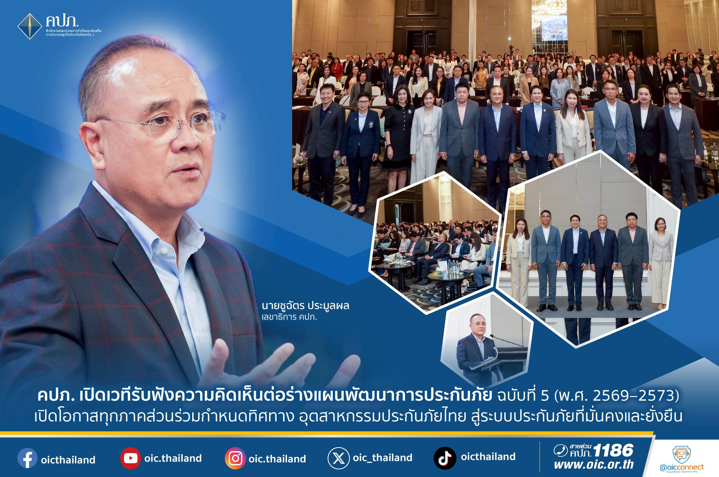 สำนักงานคณะกรรมการกำกับและส่งเสริมการประกอบธุรกิจประกันภัย (สำนักงาน คปภ.) จัดการประชุมรับฟังความคิดเห็น (Public Hearing) ต่อร่างแผนพัฒนาการประกันภัย ฉบับที่ 5 (พ.ศ. 2569–2573) เพื่อเปิดโอกาสให้ทุกภาคส่วนในอุตสาหกรรมประกันภัยได้มีส่วนร่วมในการกำหนดทิศทางอนาคตของอุตสาหกรรมประกันภัยไทยไปด้วยกัน โดยมีนายชูฉัตร ประมูลผล เลขาธิการ คปภ. เป็นประธานเปิดการประชุม เมื่อวันที่ 22 กันยายน 2568 ณ ห้องวิภาวดี บอลรูม โรงแรมเซ็นทารา แกรนด์ เซ็นทรัลพลาซา ลาดพร้าว กรุงเทพฯ