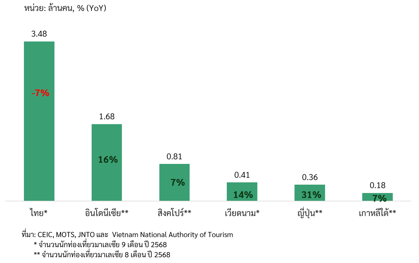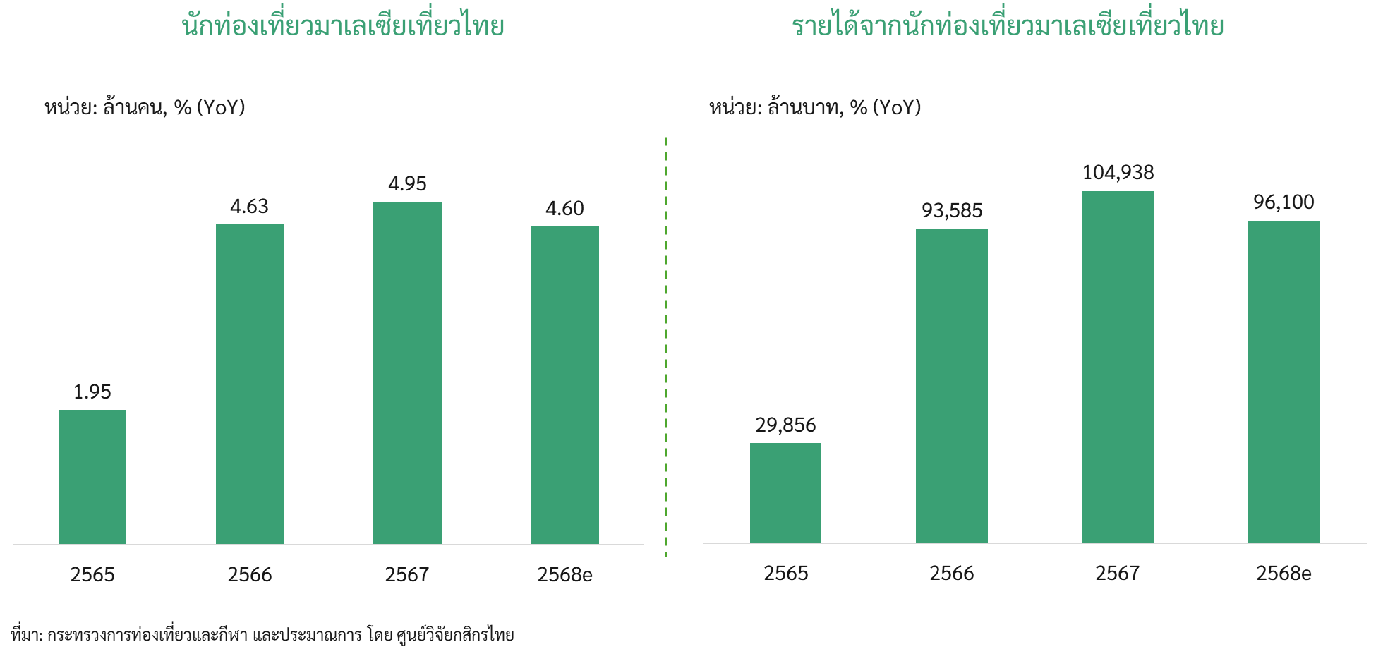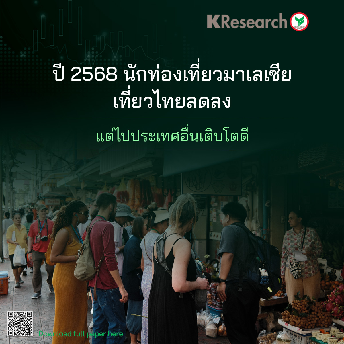 • ศูนย์วิจัยกสิกรไทย คาดว่า ปี 2568 ชาวมาเลเซียเที่ยวไทยลดลง 7% จากปีก่อน หรืออยู่ที่ประมาณ 4.60 ล้านคน ขณะที่การใช้จ่ายด้านการท่องเที่ยวคิดเป็นมูลค่า 96,100 ล้านบาท ลดลง 8% จากปีก่อน