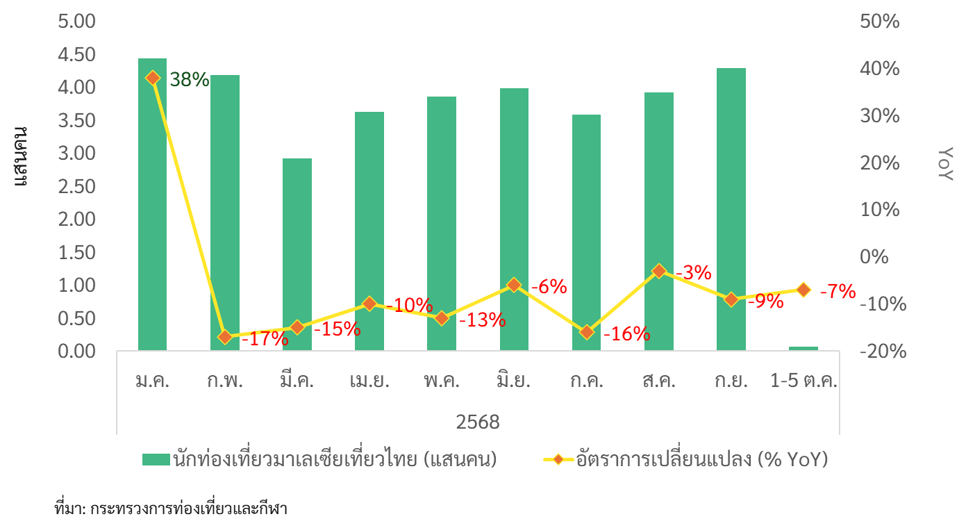 อย่างไรก็ดี สถานการณ์นักท่องเที่ยวมาเลเซียเที่ยวไทยในปี 2568 นี้ และไปข้างหน้า ตลาดนักท่องเที่ยวมาเลเชียเที่ยวไทยเริ่มมีสัญญาณน่ากังวลขึ้น เมื่อนักท่องเที่ยวมาเลเซียเที่ยวไทยลดลง จากข้อมูลกระทรวงการท่องเที่ยวและกีฬา ตั้งแต่วันที่ 1 มกราคม - 5 ตุลาคม 2568 นักท่องเที่ยวมาเลเซียเที่ยวไทยมีจำนวน 3.53 ล้านคน ลดลง 7% (YoY) (รูปที่ 2)