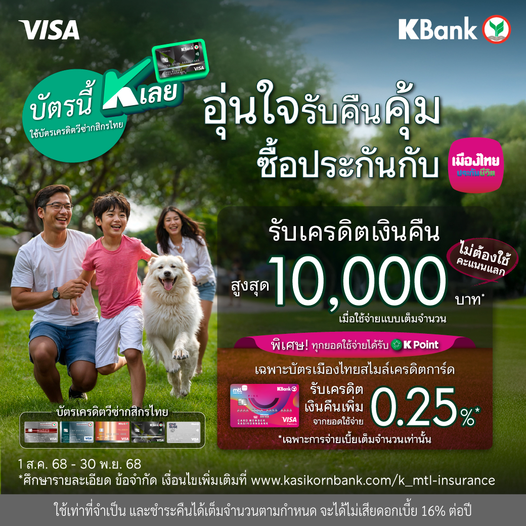 หมายเหตุ: จำกัดการรับเครดิตเงินคืนสูงสุด 10,000 บาท/ท่าน ตลอดรายการ เฉพาะบัตร THE WISDOM กสิกรไทย และบัตรเมืองไทยสไมล์เครดิตการ์ดระดับ Pink Gold จึงจะสามารถรับเงินคืน 10,000 บาทได้