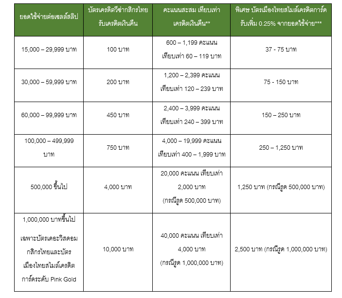 พิเศษ เฉพาะผู้ถือบัตรเมืองไทยสไมล์เครดิตการ์ด รับเครดิตเงินคืน 0.25% จากยอดชำระเบี้ยประกันภัย แบบไม่จำกัดวงเงิน พร้อมรับเครดิตเงินคืนตามยอดใช้จ่ายต่อเซลล์สลิป ดังนี้