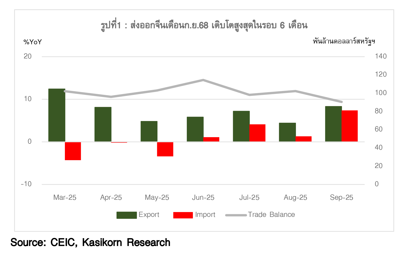 ในเดือนก.ย.68 การส่งออกจีนเร่งตัวขึ้นอยู่ที่ระดับสูงสุดในรอบ 6 เดือน เติบโตที่ 8.3%YoY จาก 4.4%YoY ในเดือนก.ย.68 ได้รับปัจจัยหนุนจากปัจจัยฐานที่ต่ำในปีก่อน และการส่งออกไปประเทศในอาเซียนที่ยังขยายตัวแข็งแกร่งที่ 15.6%YoY นำโดยการส่งออกไปเวียดนาม (+24.5%YoY) และไทย (+19.7%YoY) รวมถึงการส่งออกไปทางฝั่งยุโรป และเกาหลีใต้ยังเติบโตได้ดี ซึ่งช่วยชดเชยการส่งออกไปสหรัฐฯ ที่ยังปรับลดลง -27.0%YoY โดยการส่งออกจีนไปสหรัฐฯ ลดลงมาต่อเนื่องตั้งแต่เดือนเม.ย.68 ทั้งนี้ การนำเข้าของจีนเติบโตเร่งตัวขึ้นเช่นกันอยู่ที่ 7.4%YoY เดือนก.ย.68 จีนเกินดุลการค้าอยู่ที่ 90 พันล้านดอลลาร์สหรัฐฯ (รูปที่ 1)