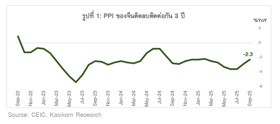 ในเดือนก.ย.68 ดัชนีราคาผู้ผลิต (PPI) ของจีนหดตัวติดต่อกันเป็นเดือนที่ 36 อยู่ที่ -2.3%YoY โดยอัตราการหดตัวลดลงจากเดือนส.ค.68 ที่ -2.9% (รูปที่ 1) เนื่องจากราคาสินค้าประเภทโลหะ (Ferrous metal) ปรับดีขึ้นจากนโยบาย Anti-Involution ของจีนที่ต้องการเข้ามาแก้ไขปัญหากำลังการผลิตส่วนเกินของจีน โดยผลผลิตเหล็ก (Steel Production) เริ่มทยอยปรับลดลง