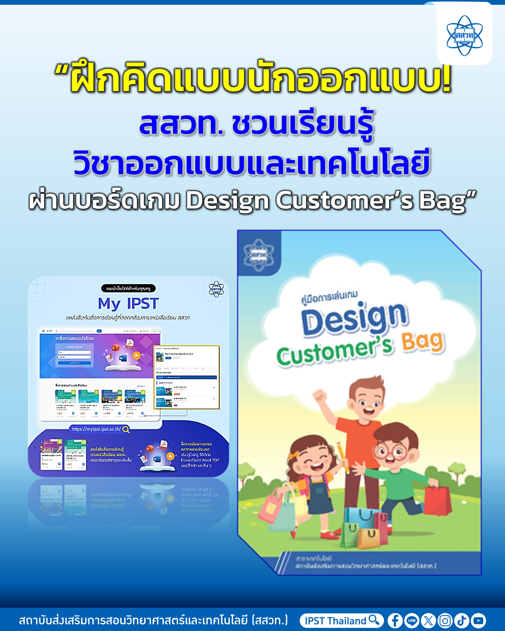 ช่วงปิดเทอมนี้ สถาบันส่งเสริมการสอนวิทยาศาสตร์และเทคโนโลยี (สสวท.) ชวนคุณครู นักเรียน และผู้ปกครอง มาสนุก ไปกับ “Design Customer’s Bag” สื่อบอร์ดเกมสร้างสรรค์เพื่อการเรียนรู้วิชา ออกแบบและเทคโนโลยี สำหรับนักเรียน ชั้นมัธยมศึกษาปีที่ 2 เป็นต้นไป ที่จะช่วยพัฒนาทักษะการแก้ปัญหาและการคิดอย่างเป็นระบบ ในเกมนี้ น้อง ๆ จะได้สวมบทบาทเป็น “นักออกแบบกระเป๋า” ที่ต้องสร้างสรรค์ผลงานให้ตอบโจทย์ความต้องการของลูกค้า ไม่ว่าจะเป็นด้าน การใช้งาน วัสดุ ความสวยงาม รูปทรง สีสัน และลวดลาย ที่ผู้เล่นจะได้เรียนรู้แนวคิดของกระบวนการออกแบบอย่างสร้างสรรค์ภายใต้เงื่อนไข และทรัพยากรที่มีอยู่ รวมถึงการพิจารณาปัจจัยต่าง ๆ เช่น เวลา ความทนทาน ความเหมาะสมกับผู้ใช้งาน และผลกระทบต่อสิ่งแวดล้อม