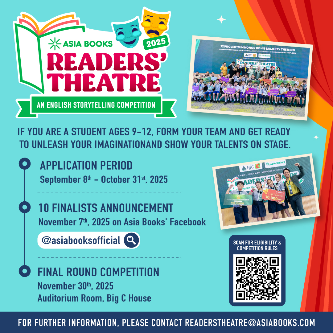 เอเซียบุ๊คส (Asia Books) ร้านหนังสือชั้นนำในกลุ่มบีเจซี บิ๊กซี เชิญชวนเยาวชนอายุระหว่าง 9–12 ปี ร่วมแสดงศักยภาพและความคิดสร้างสรรค์ใน โครงการ “Asia Books Readers’ Theatre 2025” การแข่งขันเล่านิทานภาษาอังกฤษบนเวที ที่เปิดโอกาสให้น้อง ๆ ได้พัฒนาทักษะการใช้ภาษาอังกฤษ เสริมสร้างความมั่นใจในการสื่อสาร การทำงานเป็นทีม และกล้าแสดงออกต่อสาธารณชน โดยโครงการดังกล่าว เปิดรับสมัครตั้งแต่วันนี้ – 31 ตุลาคม 2568 และจะประกาศผลผู้ผ่านเข้ารอบคัดเลือกจำนวน 10 ทีมสุดท้าย ในวันที่ 7 พฤศจิกายน 2568 ผ่านทางเพจ Facebook: @asiabooksofficial โดยจะจัดการแข่งขันรอบชิงชนะเลิศขึ้นในวันที่ 30 พฤศจิกายน 2568 ณ ห้อง Auditorium, Big C House