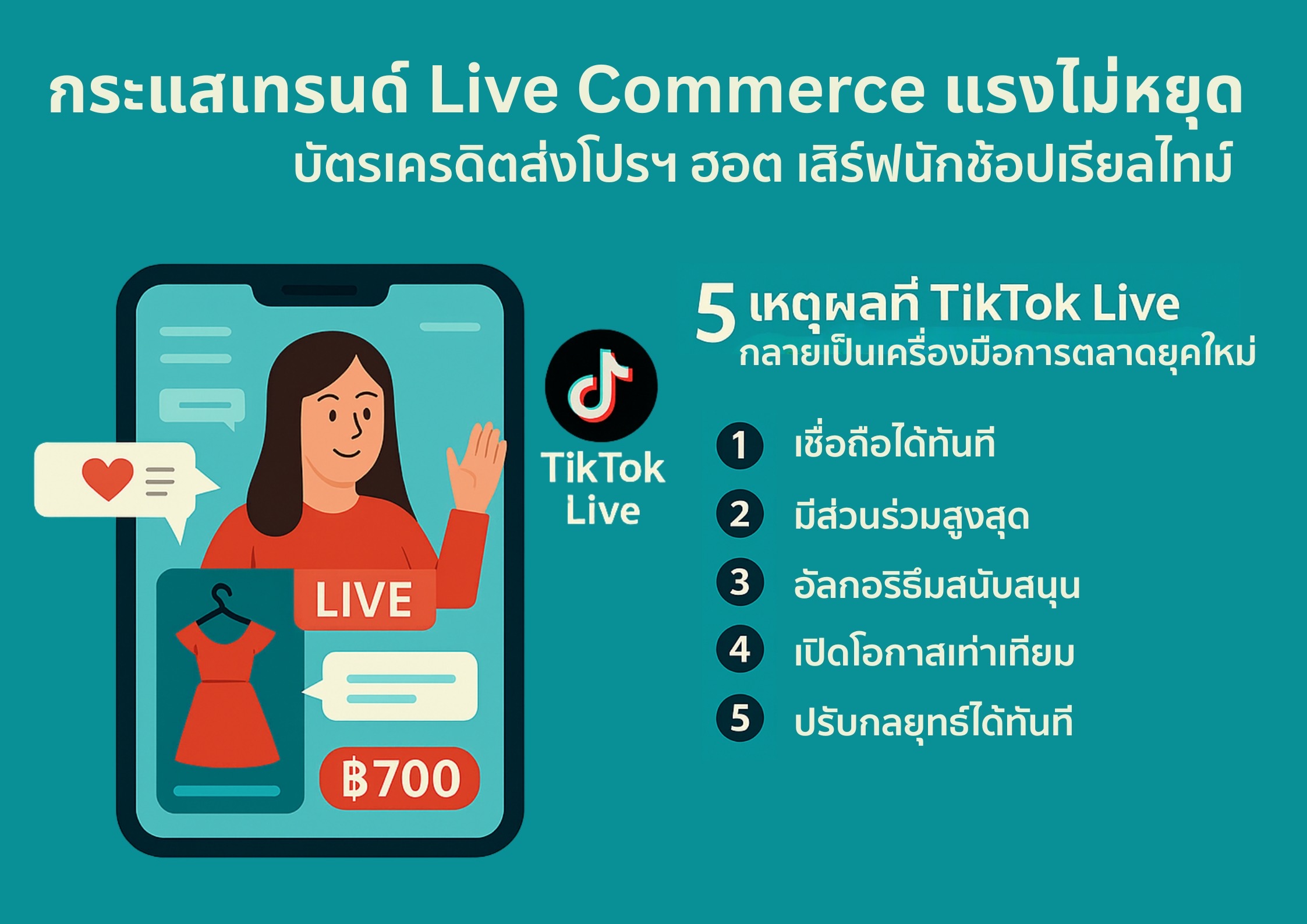 ในยุคที่ “ทุกวินาทีคือจังหวะการขาย” แพลตฟอร์ม TikTok ไม่ได้เป็นเพียงพื้นที่สร้างความบันเทิงอีกต่อไป แต่ได้กลายเป็น “เวทีค้าขายแบบเรียลไทม์” หรือ Live Commerce ที่พลิกพฤติกรรมผู้บริโภคและสร้างเศรษฐกิจใหม่ให้แบรนด์และครีเอเตอร์ทั่วประเทศ พร้อมมีการเติบโตขึ้นอย่างต่อเนื่อง ซึ่ง TikTok Shop ติดอันดับ 1 ใน 3 ของแพลตฟอร์มช้อปออนไลน์ยอดนิยม โดยข้อมูลในพอร์ตการใช้จ่ายผ่านบัตรเคทีซี สมาชิกมีการใช้จ่ายบน TikTok Shop เฉลี่ยเกือบ 6 ครั้งต่อคนต่อเดือน
