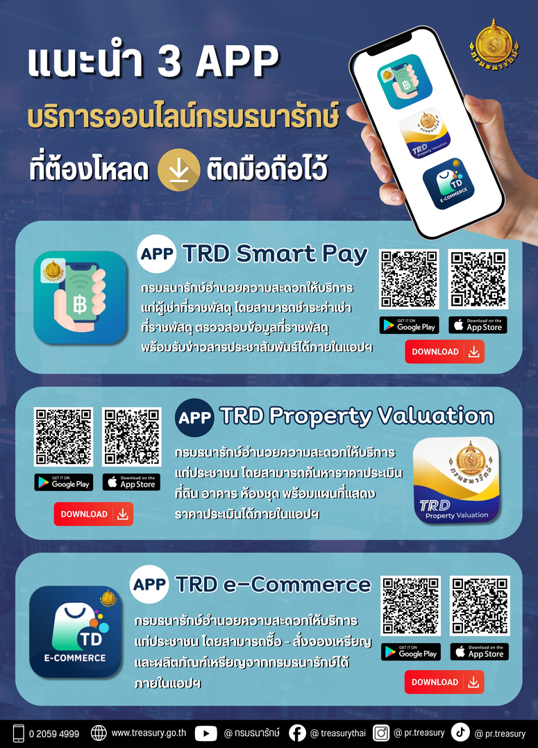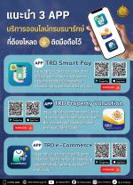 1. TRD Smart Pay “ชำระค่าเช่าที่ราชพัสดุ ได้ทุกที่ ทุกเวลา” เป็นแอปพลิเคชันที่จะอำนวยความสะดวกแก่ผู้เช่าที่ราชพัสดุ โดยครอบคลุมบริการต่างๆ ได้แก่ ชำระค่าเช่าที่ราชพัสดุ ตรวจสอบข้อมูลที่ราชพัสดุ การตรวจสอบข้อมูล การเช่าที่ราชพัสดุ อัตราค่าเช่า สัญญาเช่า แปลงที่ราชพัสดุที่เช่า การตรวจสอบรายการที่ต้องชำระเงิน ค่าเช่า ค่าธรรมเนียม หลักประกันการเช่า และเงินอื่นๆ การชำระเงินออนไลน์ผ่านบัตรเครดิต/เดบิต (Payment Gateway) และผ่านสถาบันการเงินชั้นนำ (Page to Page) รวม 7 แห่ง ประกอบด้วย บมจ. ธนาคารกรุงไทย ธนาคารออมสิน บมจ. ธนาคารกรุงศรีอยุธยา บมจ. ธนาคารไทยพาณิชย์ บมจ.ธนาคารทหารไทย บมจ. ธนาคารกสิกรไทย และ บมจ. ธนาคารกรุงเทพ โดยไม่มีค่าใช้จ่ายในการใช้บริการแต่อย่างใด และสามารถยื่นคำร้องขอดำเนินการต่างๆ เช่น ขอโอนสิทธิ สืบสิทธิ รังวัดแนวเขตการเช่า เป็นต้น รวมถึงการติดตามสถานะ และผลการดำเนินงานของเจ้าหน้าที่ พร้อมระบบการแจ้งเตือนอัตโนมัติเพื่อให้ผู้เช่าที่ราชพัสดุสามารถเข้าถึงข้อมูลข่าวสารประชาสัมพันธ์จากกรมธนารักษ์ได้ตลอดเวลา