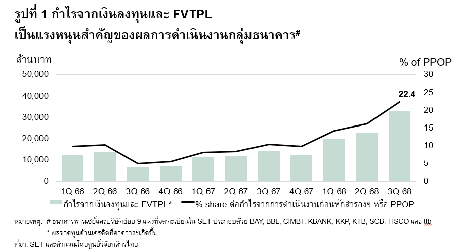 กิจกรรมทางเศรษฐกิจในภาพรวมที่ขยายตัวแบบไม่ทั่วถึง ยังคงเป็นสภาพแวดล้อมที่ท้าทายการประคองรายได้ของของกลุ่มแบงก์ โดยเฉพาะรายได้ดอกเบี้ยสุทธิ ซึ่งปรับตัวลงมาแล้ว 5 ไตรมาสติดต่อกัน (นับตั้งแต่ไตรมาส 3/2567-ไตรมาส 3/2568) อย่างไรก็ดี เป็นที่น่าสังเกตว่า กำไรจากเงินลงทุนและกำไรสุทธิจากเครื่องมือทางการเงินที่วัดมูลค่าด้วยมูลค่ายุติธรรมผ่านกำไรหรือขาดทุน (FVTPL) ปรับเพิ่มสูงขึ้น และมีส่วนช่วยหนุนผลการดำเนินงานของธนาคารพาณิชย์หลายแห่งตลอดหลายไตรมาสที่ผ่านมา (รูปที่ 1) โดยล่าสุดในไตรมาส 3/2568 รายการกำไรจากเงินลงทุน และ FVTPL ขยับขึ้นไปสูงกว่า 3 หมื่นล้านบาท2 คิดเป็นสัดส่วนประมาณ 22.4% ของกำไรจากการดำเนินงานก่อนหักสำรองฯ