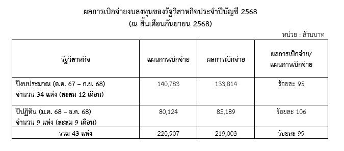 นายธิบดี วัฒนกุล ผู้อำนวยการสำนักงานคณะกรรมการนโยบายรัฐวิสาหกิจ (สคร.) เปิดเผยว่าการเบิกจ่ายงบลงทุนของรัฐวิสาหกิจที่อยู่ในการติดตามของ สคร. อย่างใกล้ชิด จำนวน 43 แห่ง แบ่งออกเป็น 2 กลุ่ม ได้แก่ กลุ่มรัฐวิสาหกิจที่ใช้ปีบัญชีตามปีงบประมาณ (รัฐวิสาหกิจปีงบประมาณ) และกลุ่มรัฐวิสาหกิจที่ใช้ปีบัญชีตามปีปฏิทิน (รัฐวิสาหกิจปีปฏิทิน) โดยในปี 2568 มีกรอบงบลงทุน จำนวน 265,561 ล้านบาท และมีผลการเบิกจ่ายสะสมตั้งแต่ต้นปีบัญชีจนถึงสิ้นเดือนกันยายน 2568 จำนวน 219,003 ล้านบาท หรือคิดเป็นร้อยละ 99 ของแผนการเบิกจ่าย ประกอบด้วยผลการเบิกจ่ายงบลงทุนของรัฐวิสาหกิจปีงบประมาณ (ตั้งแต่เดือนตุลาคม 2567 - เดือนกันยายน 2568) 34 แห่ง จำนวน 133,814 ล้านบาท หรือคิดเป็นร้อยละ 95 ของแผนการเบิกจ่าย และรัฐวิสาหกิจปีปฏิทิน (ตั้งแต่เดือนมกราคม 2568 - เดือนกันยายน 2568) 9 แห่ง จำนวน 85,189 ล้านบาท หรือคิดเป็นร้อยละ 106 ของแผนการเบิกจ่าย